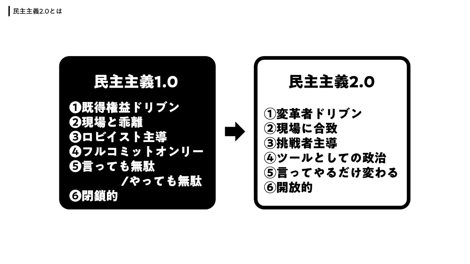 さてさて「民主主義2.0」と言うことなのですが、何を持って2.0なのかと言いますと、先ほどの私の経てきた「ルールメイキング」に対する捉え方とその変容のプロセスがまさに2.0を表していると思います。