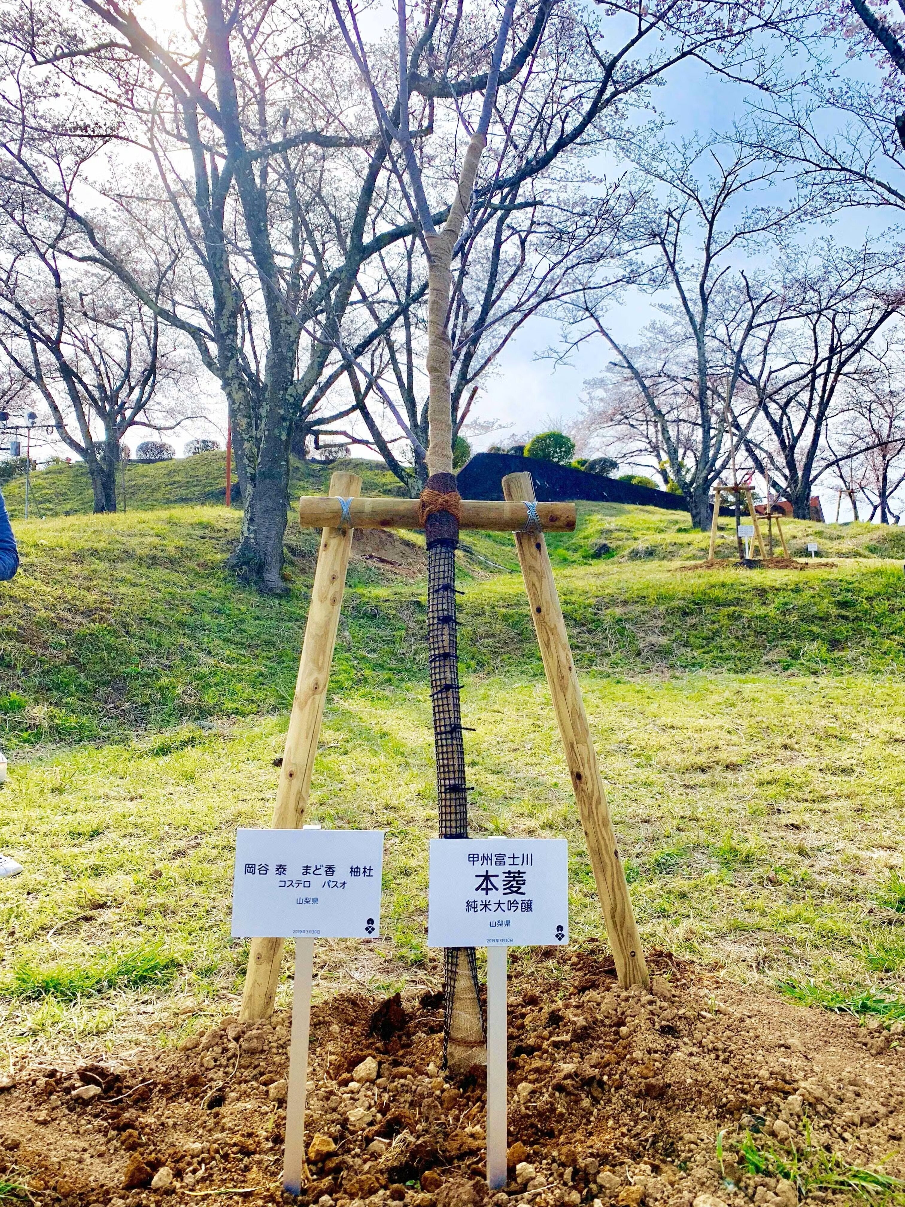 富士川町の水、富士川町の米でつくった甲州富士川・本菱・純米大吟醸には、街を代表するシンボル、ダイヤモンド富士と桜のマークがラベルにあしらわれています。多くの人が本菱や今回の桜オーナーの募集で富士川町を知るきっかけになり、実際に「自分の桜」の木の下で、街の愛情をたっぷりと詰め込んだ本菱でカンパイすることはプロジェクトに参加している私たちの悲願でもあります。その味はきっと格別なものになるはずです。2019年3月に1回目の植樹とプレートの設置を行いました。そして2020年、2021年は新型コロナウイルスの影響で、大法師公園のさくらまつりが中止になり、この2年間は8月に現地のボランティア・スタッフの手によりプレートの設置を行いました。(事前にWeb上でくじ引きをさせていただきました)。クラウドファンディングに参加していただいたすべてのみなさまに、ご自身のプレートの設置に参加する権利を付与させていただきますので、ご案内させていただきます。根腐れ防止の関係で毎年3月の植樹が一番適しているとのことです。植樹したばかりの桜はまだ咲きませんので、ご注意ください。街のシンボル、桜を背に、街の新たなシンボル、本菱を飲む。桜と日本酒。日本が誇る文化を、みんなで感じられたら、とてもうれしいです。