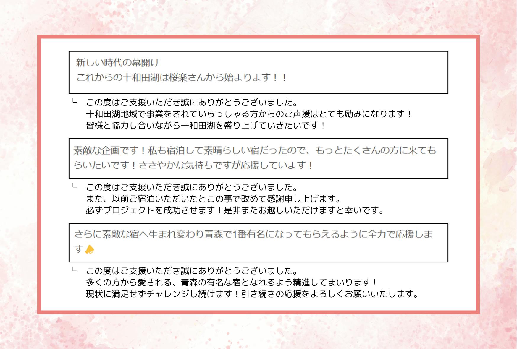 他にもCAMPFIRE上のコメントや、個別での応援メッセージを多数いただいております。皆様、改めて感謝申し上げます。