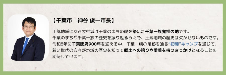 この千葉市、そして土気地域には千葉一族が礎を築いた素晴らしい街並み・過去から学ぶことができる城址などの歴史資源が今もなお脈々と息づいています。