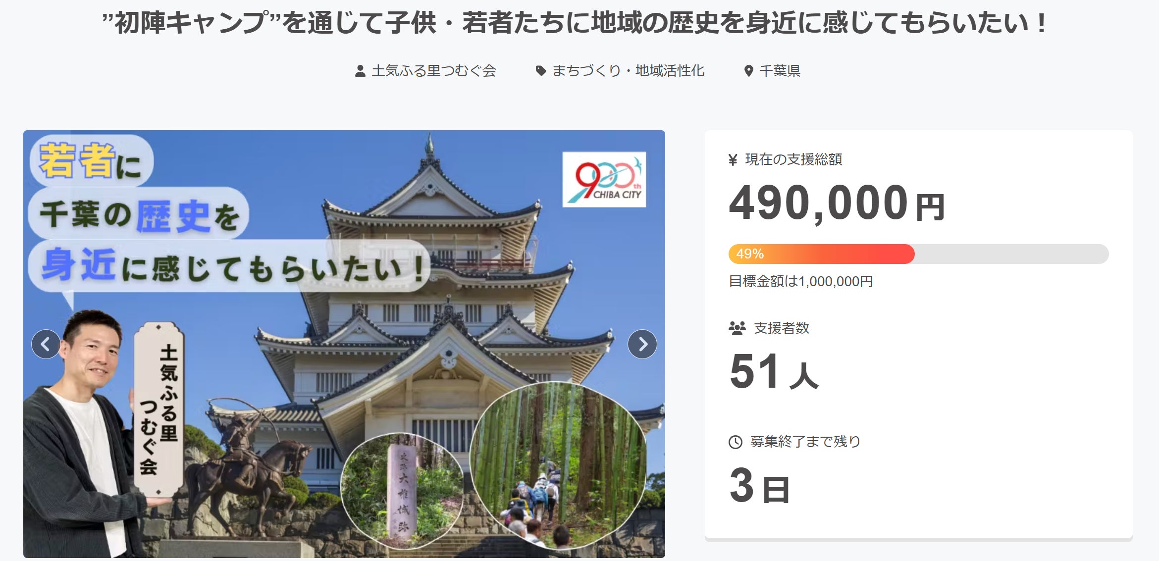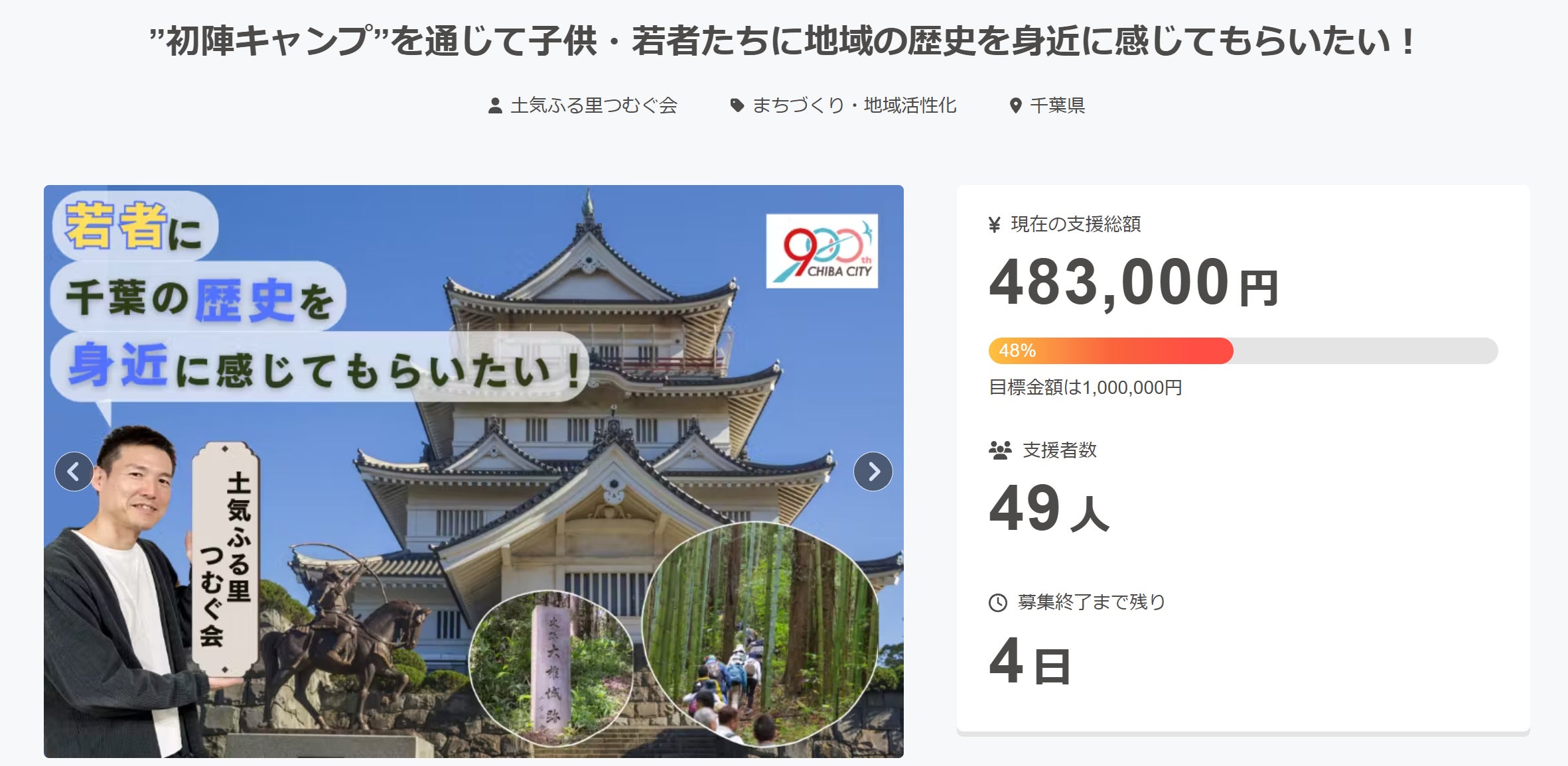 たくさんのご支援・応援ありがとうございました!こんにちは!土気ふる里つむぐ会の三浦ですっ♪先日、”初陣”キャンプの実現を目指した本プロジェクトが終了いたしました。皆さんから多くのご支援と熱い応援をいただき、まずは本当にありがとうございました!ですが、今回は残念ながら目標金額に達することができず、本当に悔しいですが全額返金という結果となりました(´;ω;`)ひとえに、私自身の力不足と至らなさと自覚しております。くじけず前進していきますので、今後もぜひ応援をお願いいたします!反省はしなければなりませんが、子ども・若者たちのために”初陣”キャンプという『原体験』の機会を創ることを諦めたわけではありません!まず2025年の活動ですが、採択いただいた千葉市緑区の「地域活性化支援事業」や千葉市生涯学習センターの「市民自主企画講座」などの事業をはじめとして、引きつづき地域の歴史資源を紹介したり、フィールドワークで実際に現地を歩く機会を設けてまいります!そして、並行して”初陣”キャンプ実現に向けて改めて歩みを進めてまいります!後ほど、よりブラッシュアップした企画のお知らせをさせていただきますので、乞うご期待!これからも皆さんと一緒に”初陣”キャンプ実現を目指します♪本日もお読みいただきありがとうございました(^^)さあ、みんなで一緒に”初陣”キャンプにいざ出陣!
