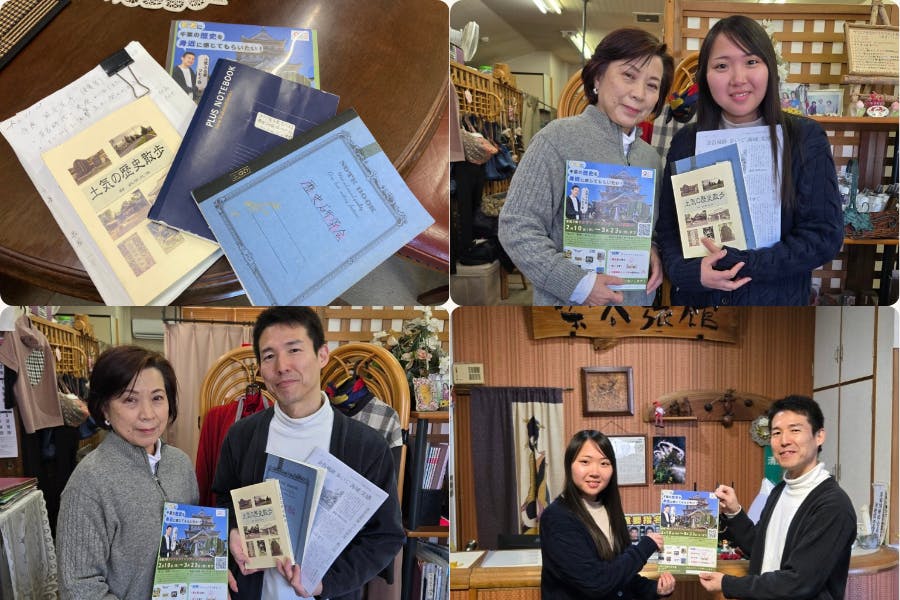 ※写真左上:歴史研究会の資料の一部(実際は膨大な量ですのでこれから少しずつご紹介できたらと思います)。写真右上:歴史研究会の中心メンバーであり「土気つむのお母さん」石田さんと土気つむメンバー玉堀さん(石田さんが経営する土気にあるアロマショップ「ふぁいん」にて撮影)。写真左下:同じく石田さんと土気つむ代表の三浦(「ふぁいん」にて撮影)。写真右下:歴史研究会メンバーでもあり土気つむメンバーでもある染谷さんが経営する土気の老舗旅館「染谷旅館」にて。