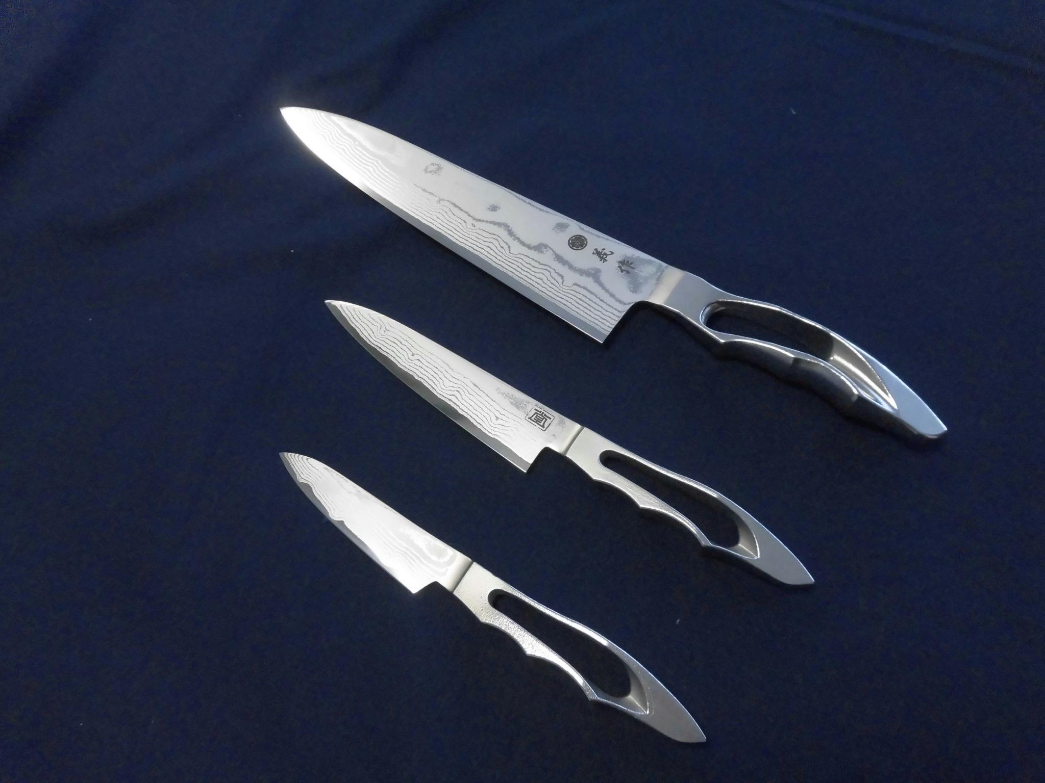 上から、三徳包丁・ペティナイフ・ペアリングナイフ、