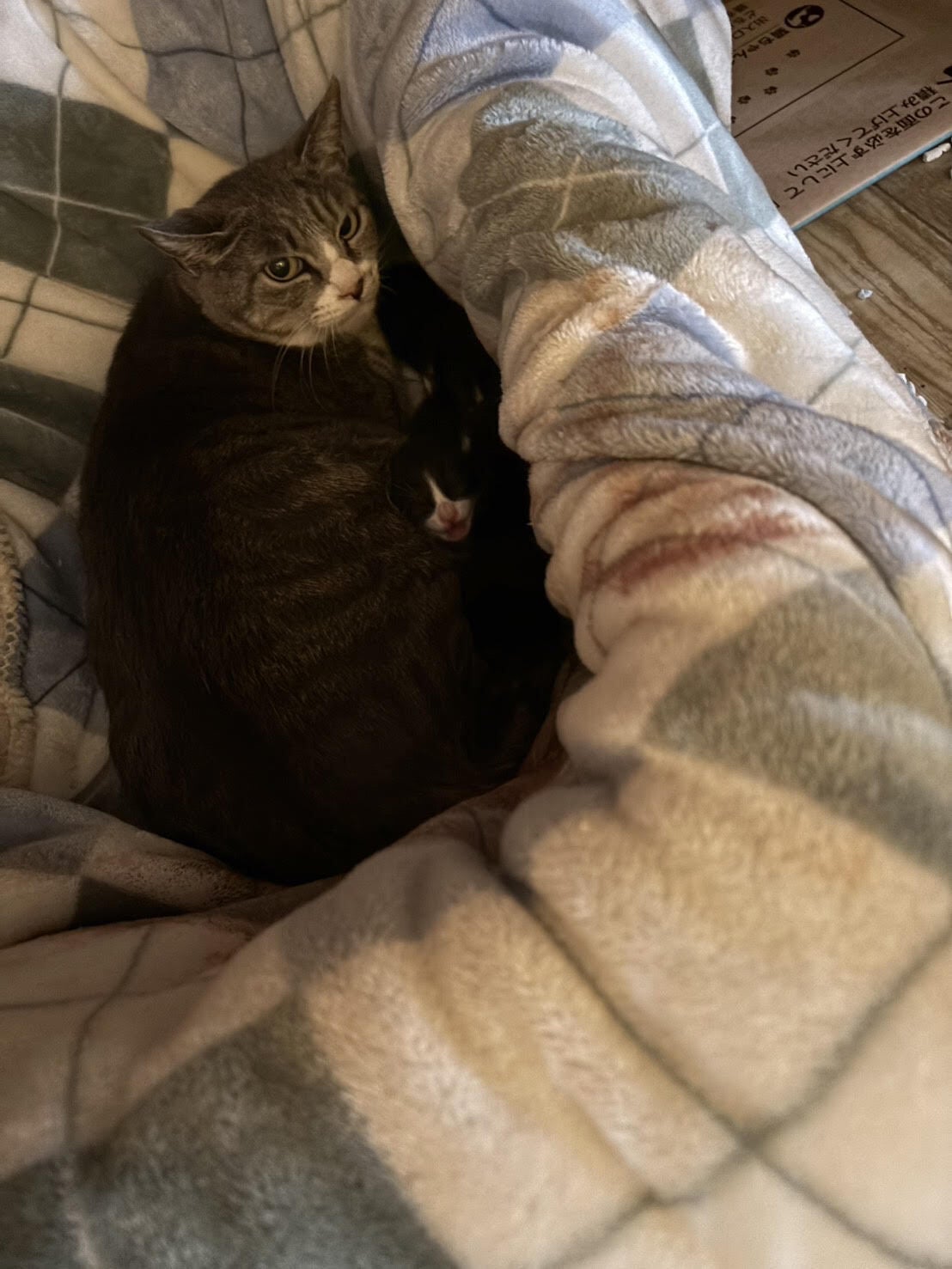 妊娠後期だったため堕胎はせずに見守っていましたが、昨日無事に子猫を出産しました!外で生まれなくて本当に良かった。。