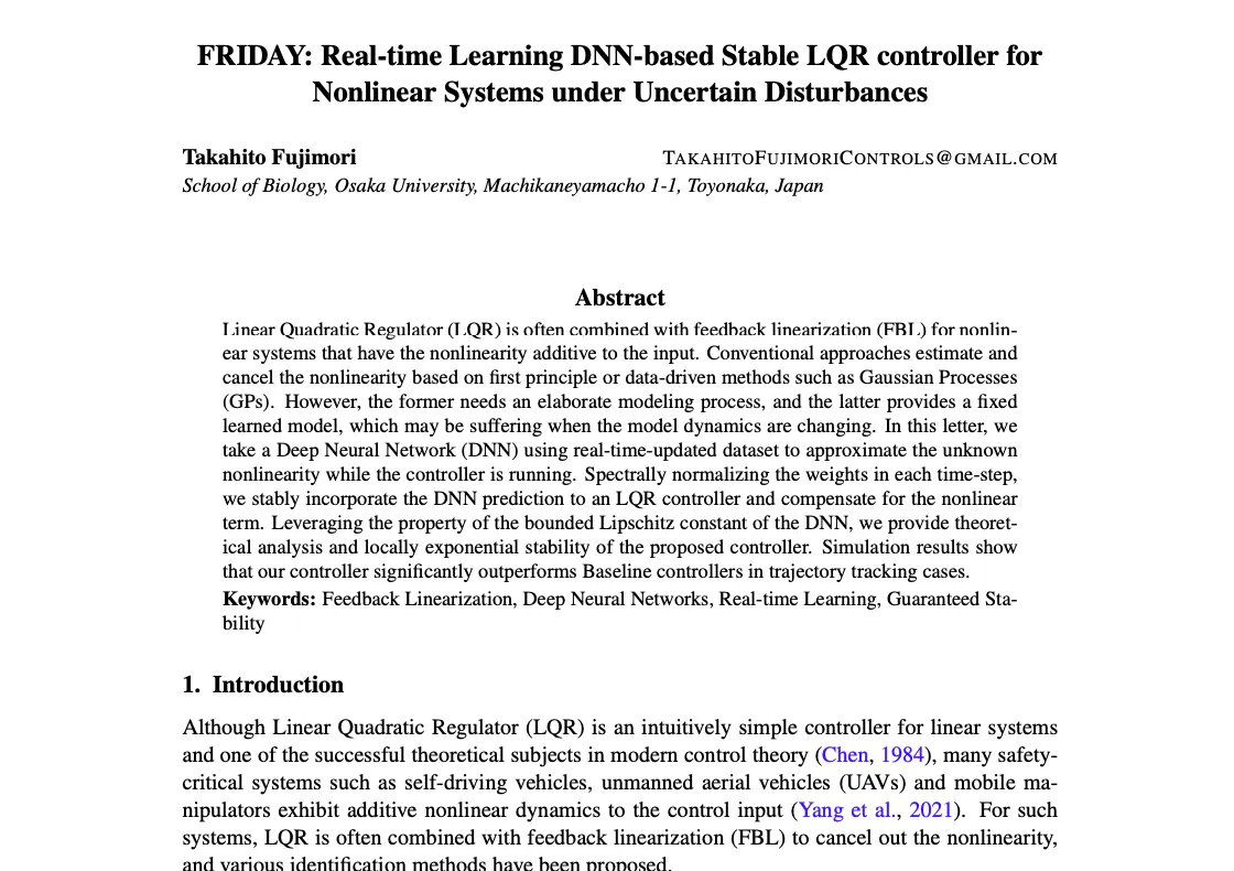 2024年 単著論文"FRIDAY: Real-time Learning DNN-based Stable LQR controller for Nonlinear Systems under Uncertain Disturbances"がarXiv System & Control コミュニティに承認される