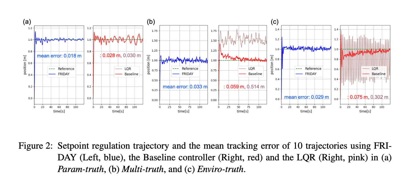そのような課題に対して有効だと思われるアプローチが、認証性の国際論文pre-prtintサイト「arXiv」に掲載されたばかりの「FRIDAY: Real-time Learning DNN-based Stable LQR controller for Nonlinear Systems under Uncertain Disturbances」です。この最新技術を論文筆者本人がドローンの姿勢安定化に活用します。 FRIDAYはセンサーから読み取った未知の乱流をリアルタイムで学習し、従来の線形コントローラーの約10倍、適応型コントローラーの約2倍の精度で経路に追従することができる制御アルゴリズムです。また FRIDAYはソフトウェアによって実装が可能なため、現在市販されている軽量ドローンのハードウェアはそのままに姿勢安定・経路追従の精度を飛躍的に向上させることが期待でき、上述の2つの課題解決に繋がります。
