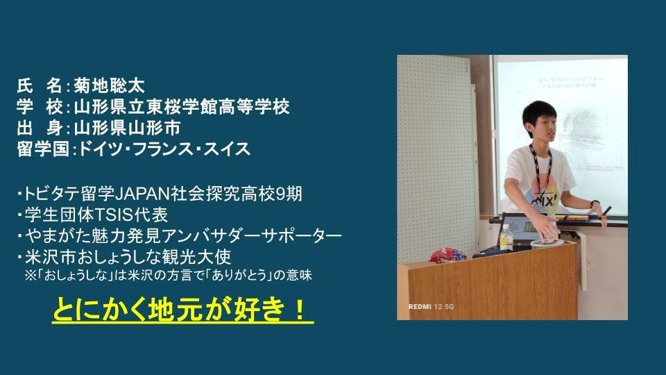 このために、3月に山形市内で留学のイベントを開きます。このイベント内で、トビタテ留学JAPANを利用し留学に行った複数の生徒が留学を通して得た学びを発表し、それぞれの生徒の発表のテーマと親和性の高い団体や企業を招き入れ、トークセッションを行い、今後の山形について考える場を作りたいと考えています。