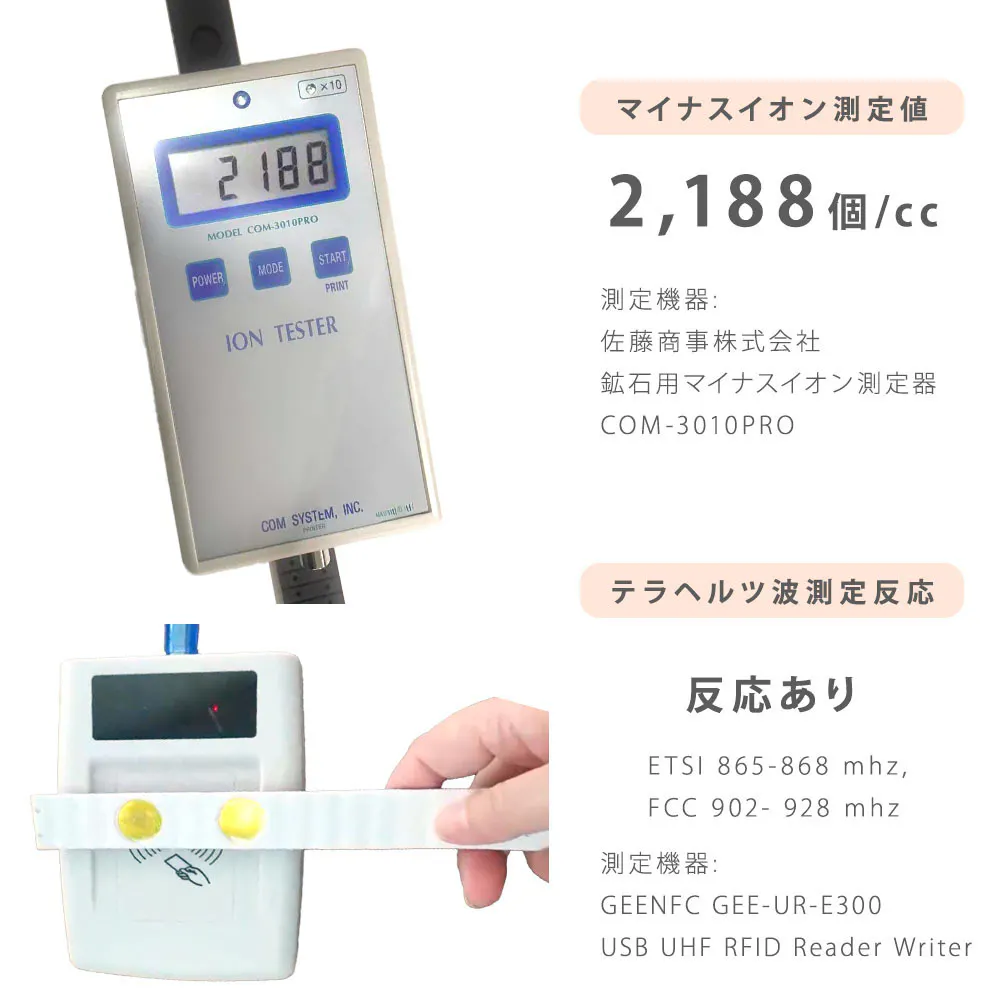 Tesla Globeは、テラヘルツ波とマイナスイオンを放出するキャビンで48時間置いたチップが2枚埋め込まれていて、マイナスイオンの測定値はなんと2,188個/cc。