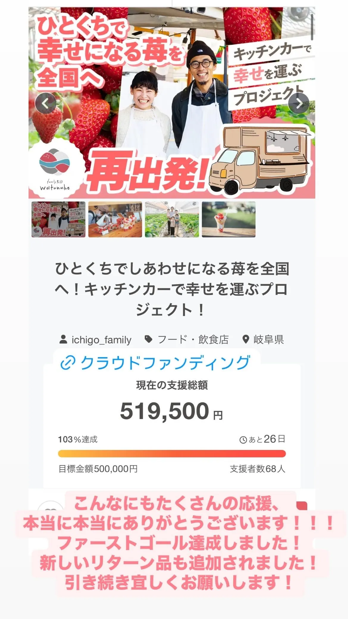 私たち夫婦が心を込めて育てる「ひとくちでしあわせになる苺」をもっとたくさんの人に届けるため、ぜひ応援していただけると嬉しいです。新しいキッチンカーで全国を巡り、しあわせを運べるように頑張りますので、応援をよろしくお願いいたします!