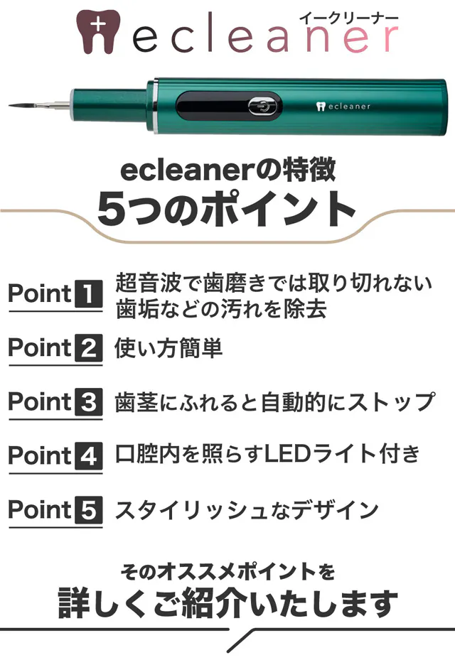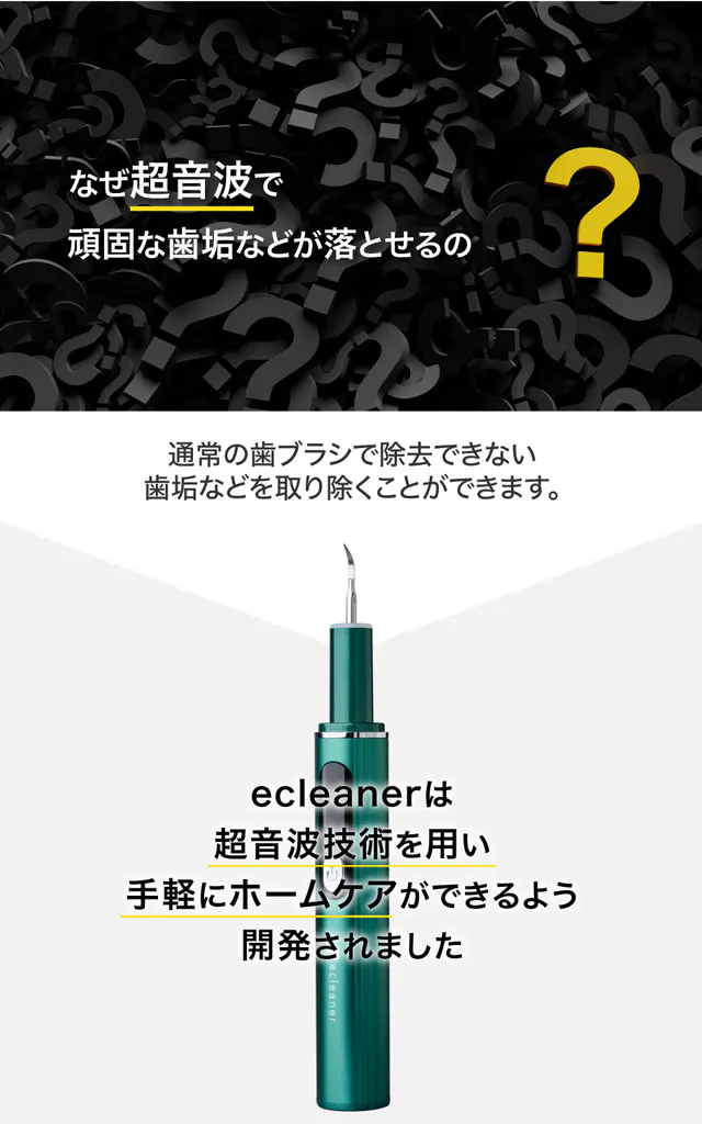 A:歯科医院を受診いただき、専用の超音波スケーラーで取り除くケアが必要となります。そういった点からも、このecleanerはとても優れた製品だと思いました。