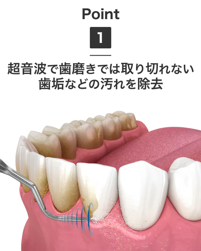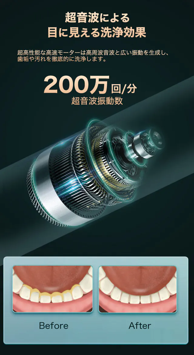 毎分200万回の振動で、歯磨きでは落としきれない頑固な歯垢や汚れを破壊し、徹底的に除去します。
