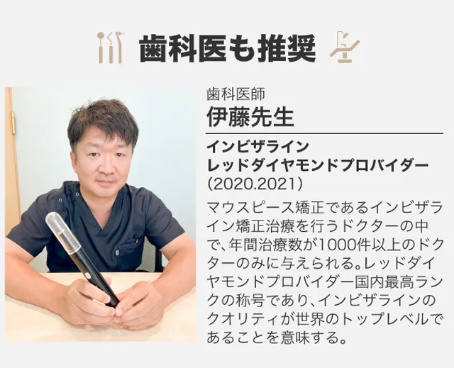 定期的な歯科検診の間に、歯をきれいな状態を維持しておきたい、そんな患者様にピッタリの製品だと思います。マウスピース矯正をされている患者様にも積極的に推奨したいですね。歯科医療従事者である私達も、歯科を受診する側になることは少ないので自宅に置いておきたい製品です。