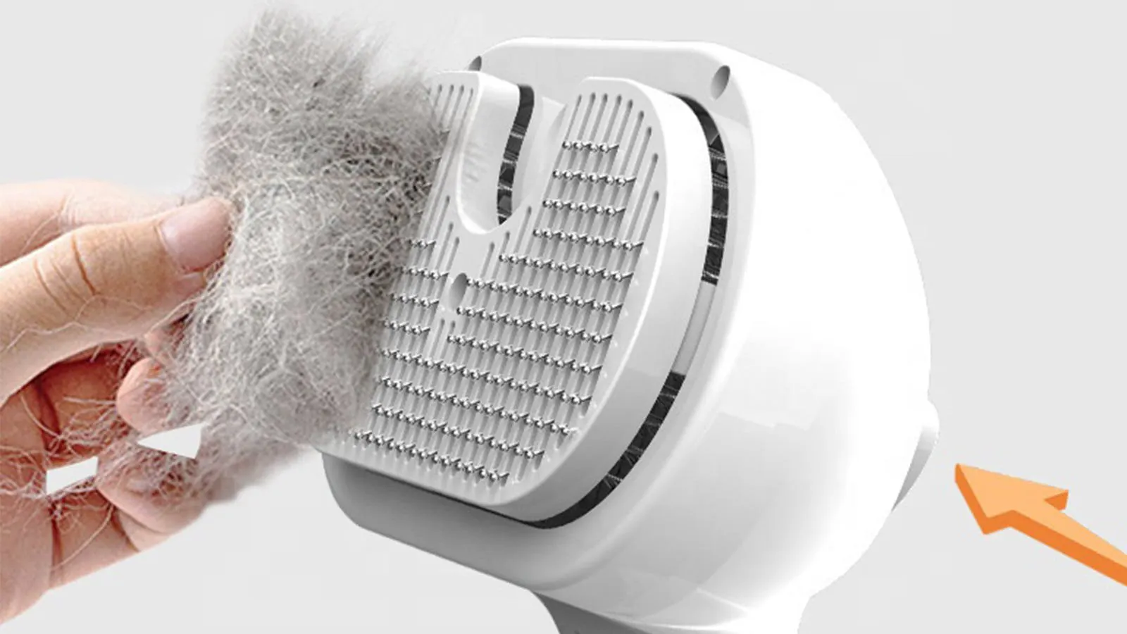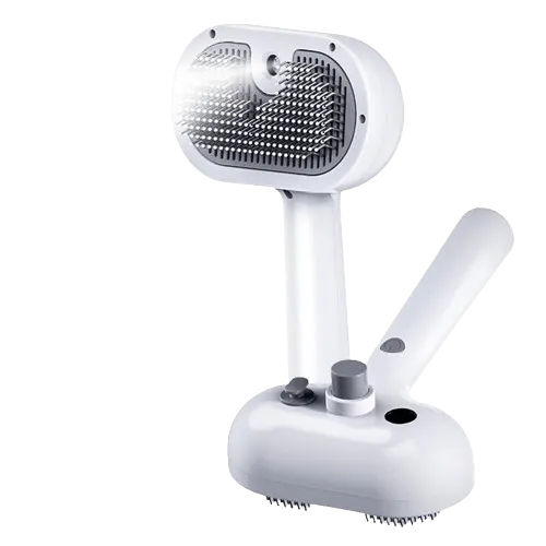 A: ミストタンクに水や専用スプレーを入れ、ブラシをペットの毛並みに沿って使います。ブラシのスイッチを押すとミストが噴射される仕組みです。