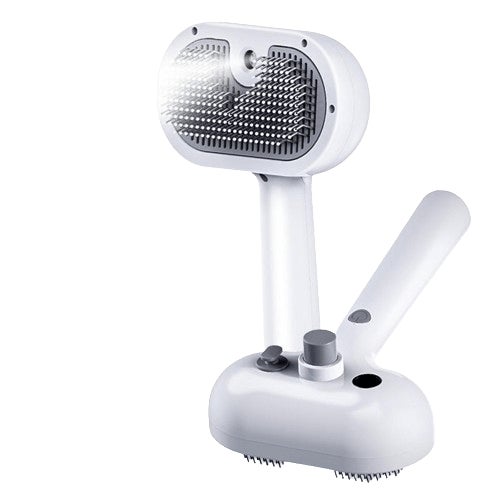 A: ミストタンクに水や専用スプレーを入れ、ブラシをペットの毛並みに沿って使います。ブラシのスイッチを押すとミストが噴射される仕組みです。