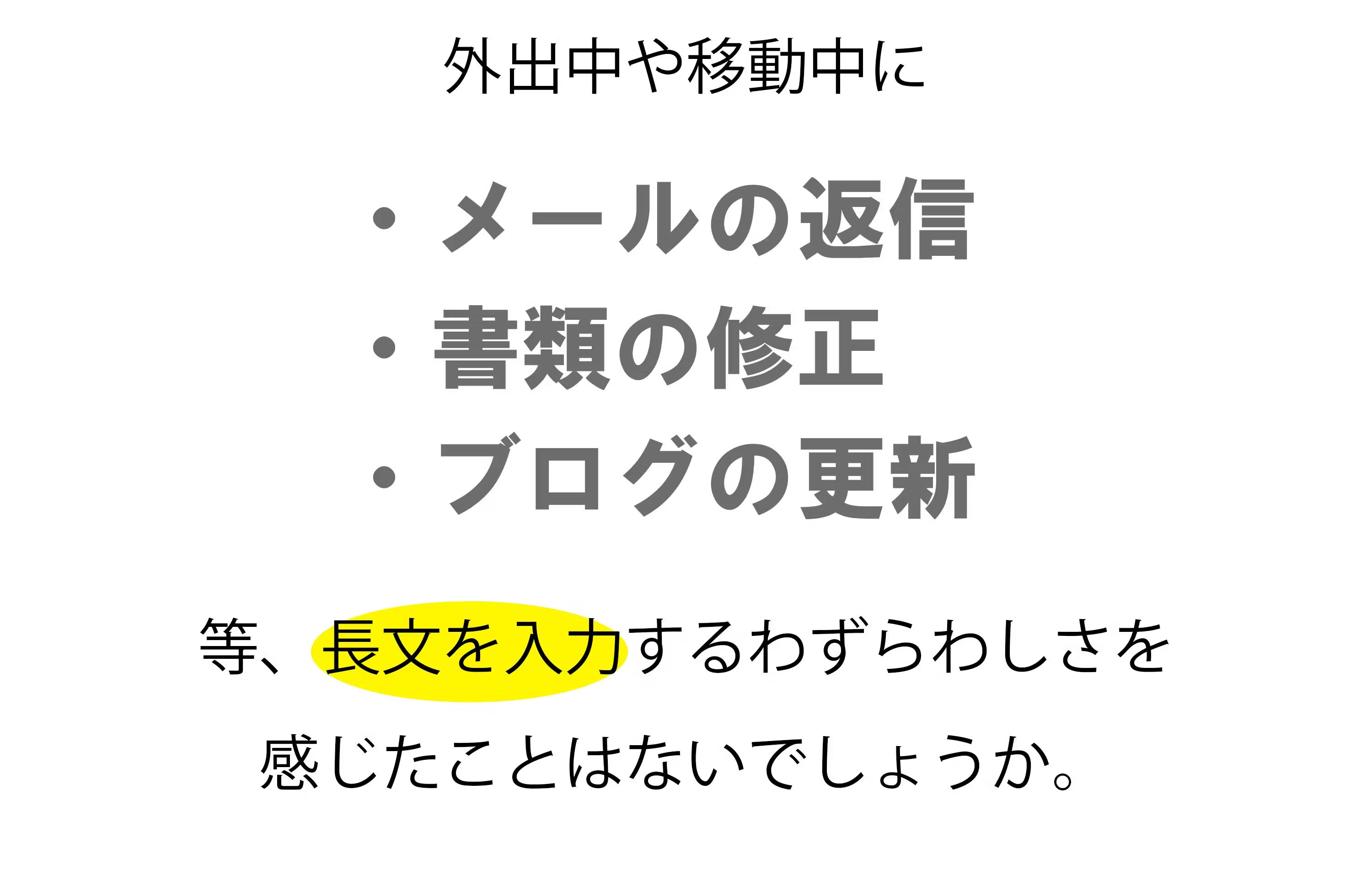 スマホやタブレットの普及により、大きくて重いパソコンの代わりに、スマホやiPadを持ち歩いている人が増えています。しかしながらスマホやタブレットでの長文の入力は、ほんとうにわずらわしく、タイピングだとたいした時間もかからない文章も、入力だけで骨が折れます。