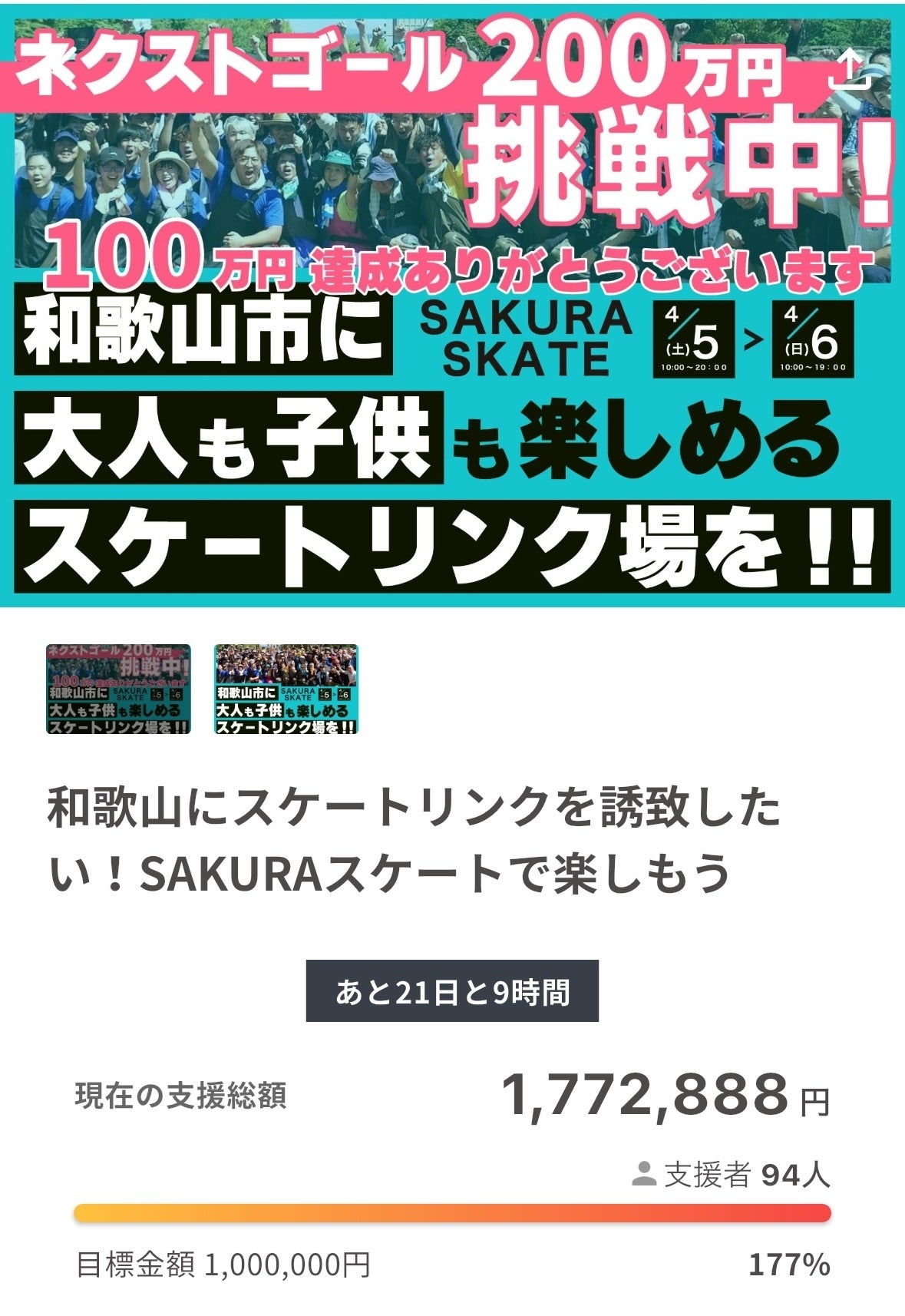 3/1にクラウドファンディングがスタートして現在の進捗状況は177%まできました!残り23万円となりいよいよ最終段階です。期間はまだ3週間ありますが1日でも早く達成をしてイベントに備えたいと思います。皆様どうか拡散のほどよろしくお願いします。もう少しの間お付き合い下さい。