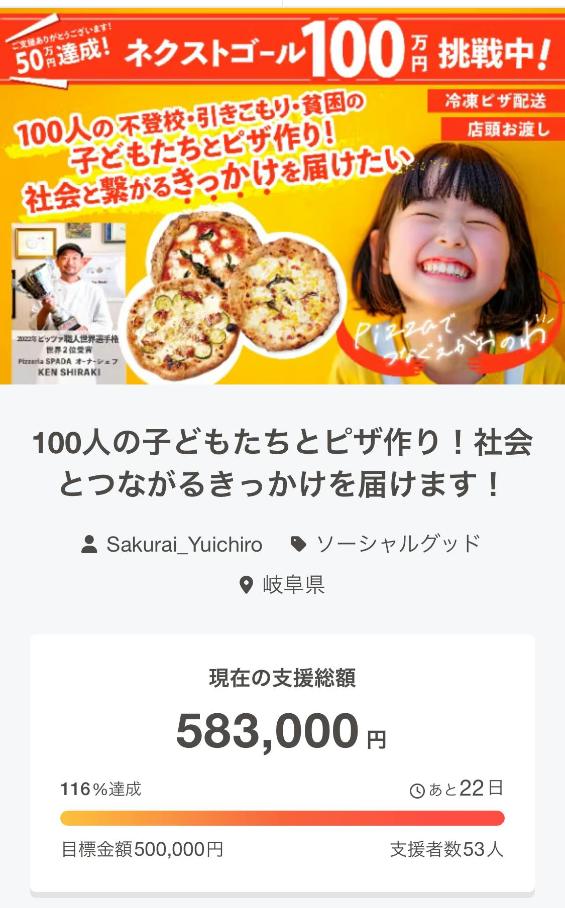 2025/06/08 13:0653名の皆さまへ感謝申し上げます!第一段階の目標を達成することができました。今回、スパーダが取り組んでいる職業体験型子ども食堂を知っていただき、一緒にこの活動をしていただくためにクラウドファンディングをスタートしましたが、第一段階の目標50万円に到達することができました。これも、いち早くご支援いただきました53名の皆さまのおかげです。誠にありがとうございます!私たちの今回のゴールは、100人の子どもたちに安心安全な場で職業体験してもらうことです。子どもたちとは、、、不登校、引きこもり、貧困の子どもたちへピザ焼き体験をしてもらい、食事の提供をする場にしています。ピザ体験と食事をしてもらうためには、ひとり4000円が必要となります。ひとり分の体験料を寄贈する権利も用意しておりますので、ご支援いただけましたら幸いです。 ネクストゴール100万円!!子どもたち100人分のご支援を集めさせていただくためには、(運営、材料費など経費などを含めて)100万円が必要となります。 どうか多くの方に知っていただきたく、シェアをしていただけますと大変嬉しいです。PIZZERIA SPADA白木 健▽100人の子どもたちとピザ作り!社会とつながるきっかけを届けます!https://camp-fire.jp/projects/818122/view もっと見る
