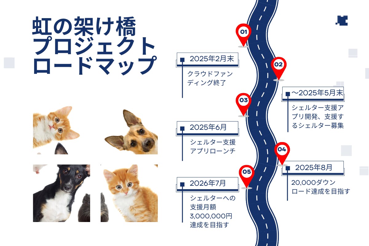 2025/02/28 17:05皆さま、「虹の架け橋プロジェクト」 のクラウドファンディングにご支援・応援いただき、本当にありがとうございました!温かいご支援のおかげで、保護犬・保護猫の未来を変える大きな一歩を踏み出すことができました。プロジェクトのスタート地点に立つことができたのは、心を寄せてくださった皆さまのおかげです。心より感謝申し上げます。ですが、私たちの活動はここで終わりではありません。むしろ、本当のスタートはこれから です。「継続」こそが、このプロジェクトの最大の価値動物保護の現場では、これまで多くの支援が「一時的なもの」に留まることが課題でした。「ニュースで見たから」「かわいそうだから」—— そんな想いからの支援も、もちろん大切です。ですが、動物たちはずっと生きていきます。シェルターの運営も毎日続いていきます。だからこそ、支援を「継続できる仕組み」にすることが、何よりも重要なのです。「推しの仔」機能で、ずっと応援できる仕組みをつくるシェルターと支援者が直接つながれる仕組みを提供する定期的な支援・イベントを通じて、支援の流れを止めない皆さまからのご支援をもとに、この仕組みをしっかりと作り上げ、育てていきます。「一度きりの支援」ではなく、「ずっと続く支援」を—— それが、私たちの掲げる虹の架け橋 です。これからの展開について今回のクラウドファンディングは終了しますが、プロジェクトはここから本格的に動き出します。まずはアプリ開発を進め、支援が持続する仕組みを作ることを最優先に取り組みます。開発状況の報告や今後の取り組みについても、定期的に皆さまにお知らせしていきます!引き続き、見守っていただけると嬉しいです。 もっと見る