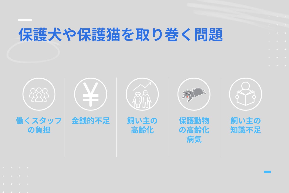 多くの動物が、飼い主の高齢化などにより入院等で面倒が見れなくなったり、飼い主の経済貧困により手放されています。