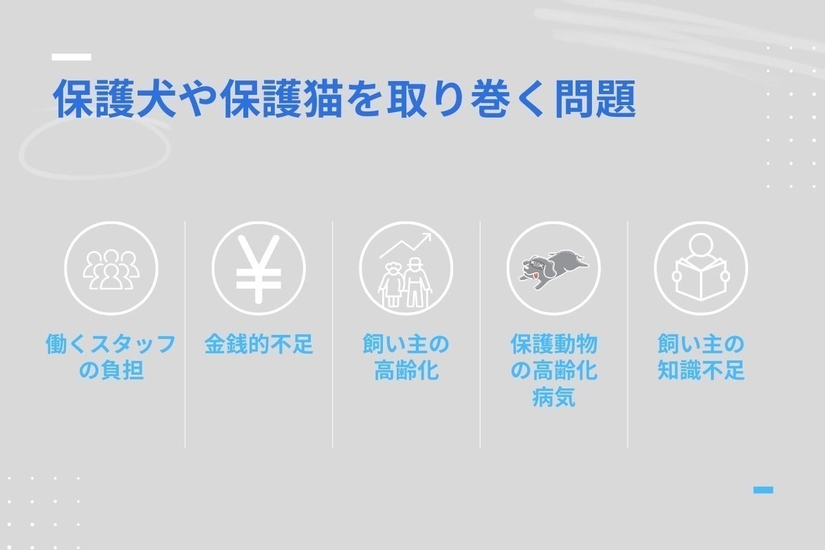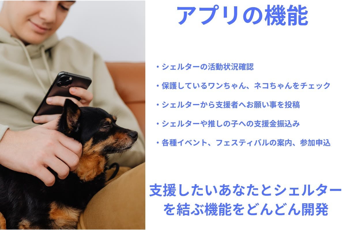 このプロジェクトでは、動物保護シェルターで働く方々の負担を軽減し、保護された命がより良い環境で新しい家族を待てるよう、縁組機会の創出と支援アプリを開発・運用することを目指しています。