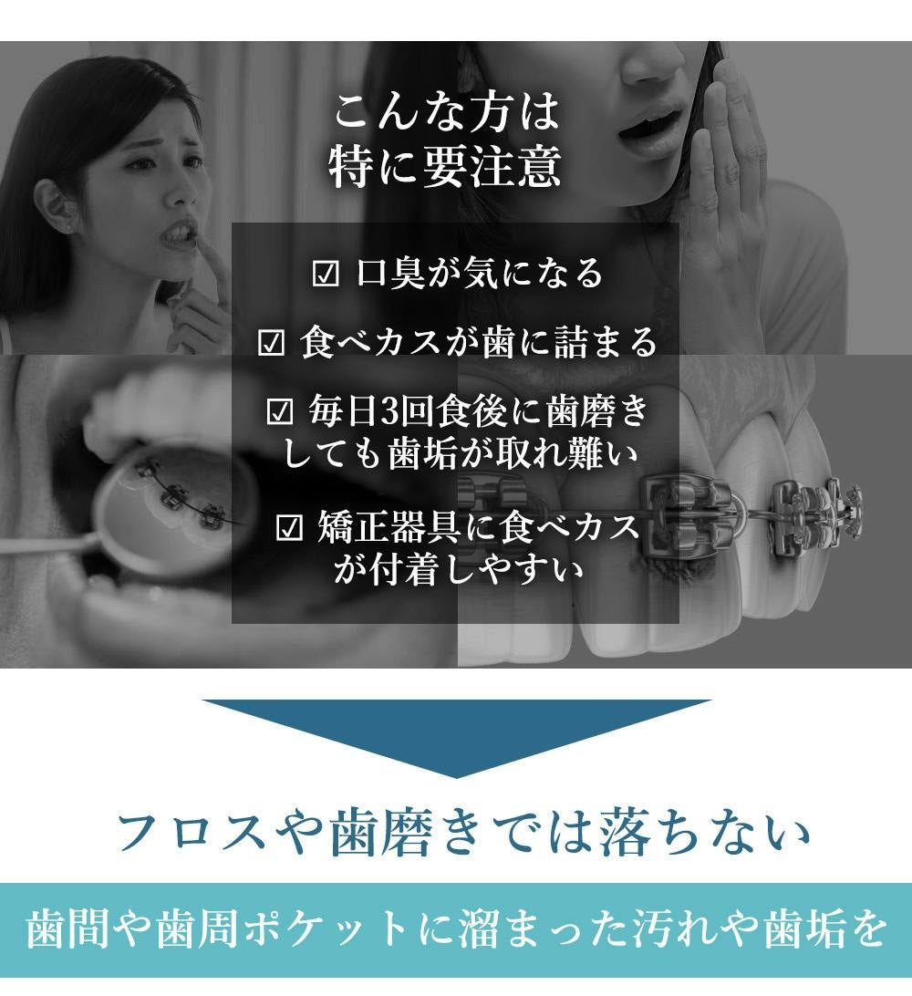 ・乳幼児や小さなお子様に本製品を使用させたり、遊ばせたりしないでください。感電の恐れがあります。 ・本製品の分解・改造は絶対しないでください。発火や事故、故障の原因になります。・商品を廃棄する場合は、お住まいの自治体の廃棄方法に従って捨てて下さい。・製品を火器に近づけたり、加熱しないでください。 ・高温の場所でで充電、使用、保管、口の洗浄をしないでください。 ・ノズルを取り付けずに本製品を使用しないでください。 ・濡れた手で電源プラグや充電プラグに触れないでください。 ・給水タンクに 40℃以上の水を入れないでください。 ・製品を口内や歯以外の場所に使用しないでください ・口内に異常が見られる方、治療中の方は、使用前に医師に相談してください。 ・使用中に異常が見られた場合は使用を中止し、医師にご相談ください。 ・水に溶けない成分が含まれる物を水タンクに注入しないでください。 ・機械を長時間使用しない場合や清掃する場合は、電源プラグと充電器を抜いてください。 ・歯茎から出血することがあります。出血量が多い時は使用を中止し、医師にご相談下さい。