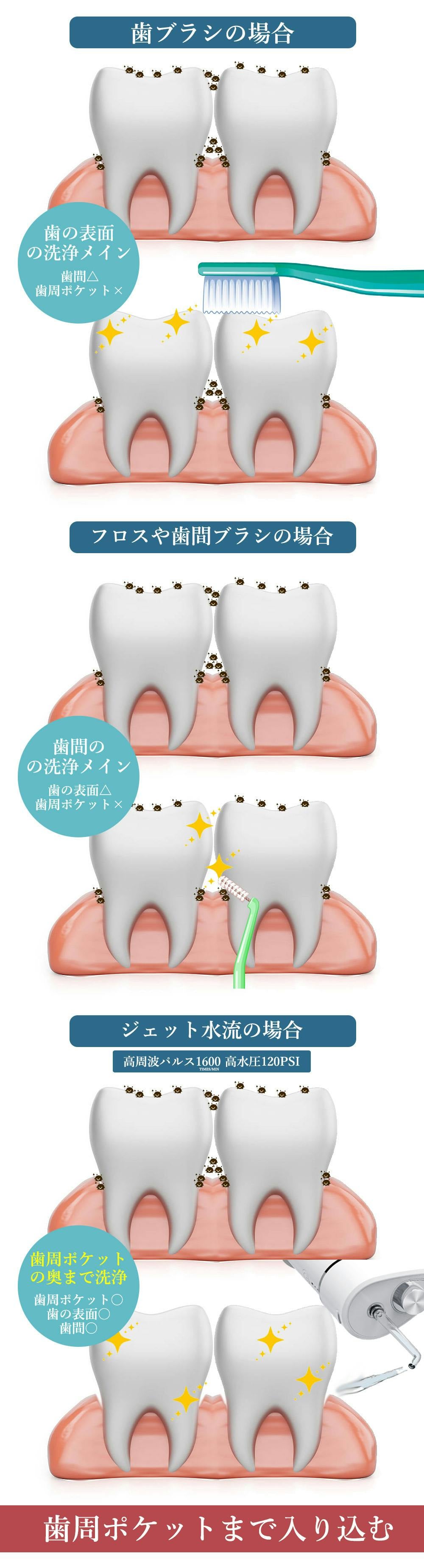 1.クリーニング モード (1番目のモードライト点灯)食後の使用や、特に汚れている時に適しています。歯の隙間に深く残った残留物を取り除きます。