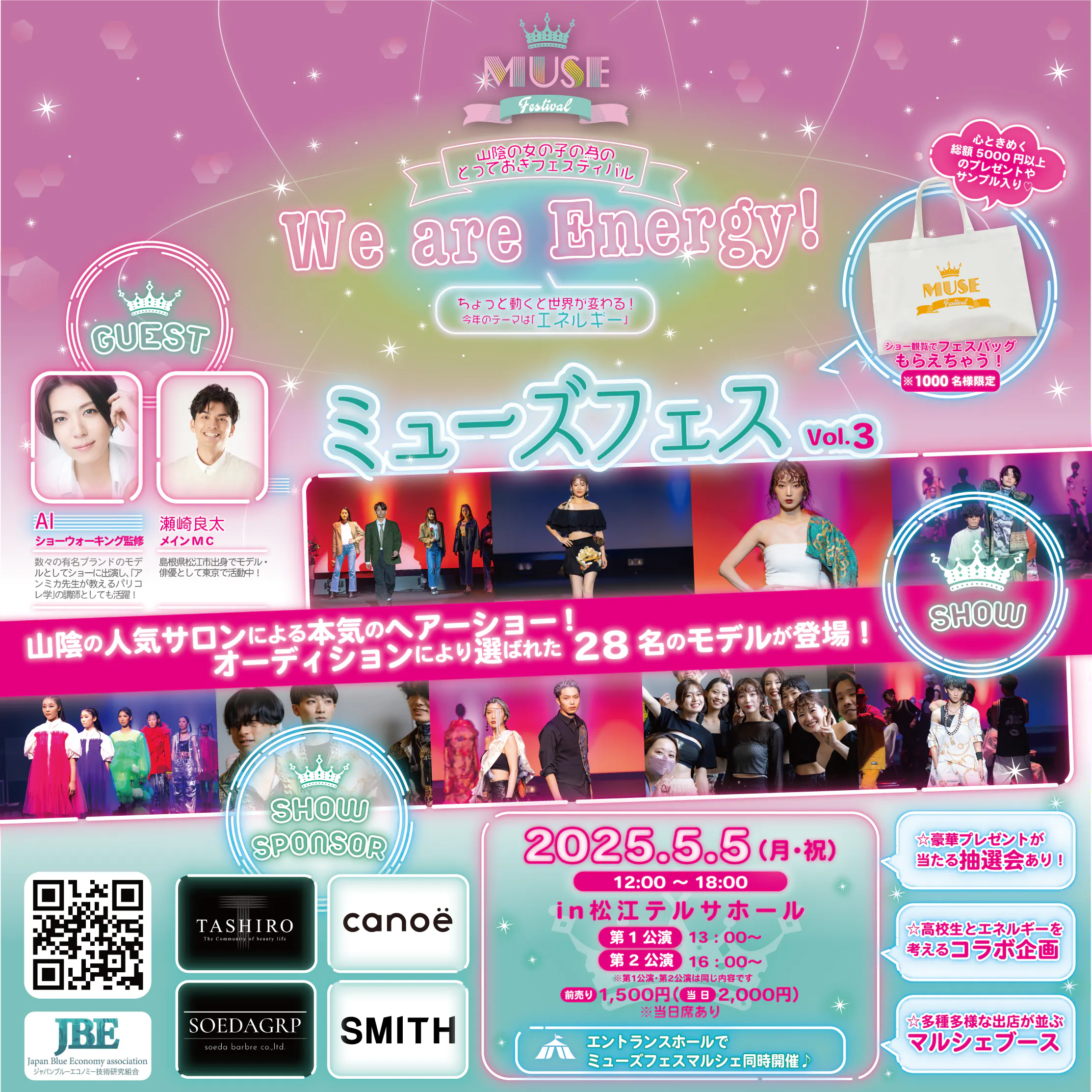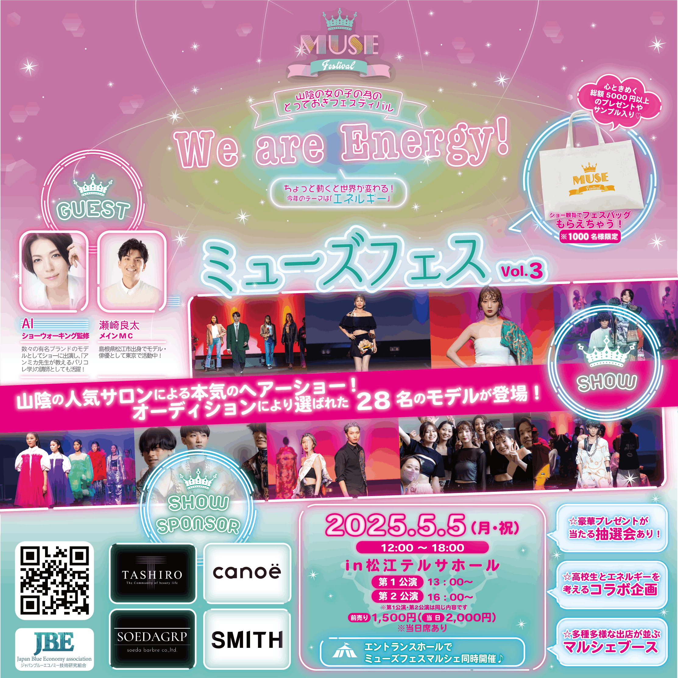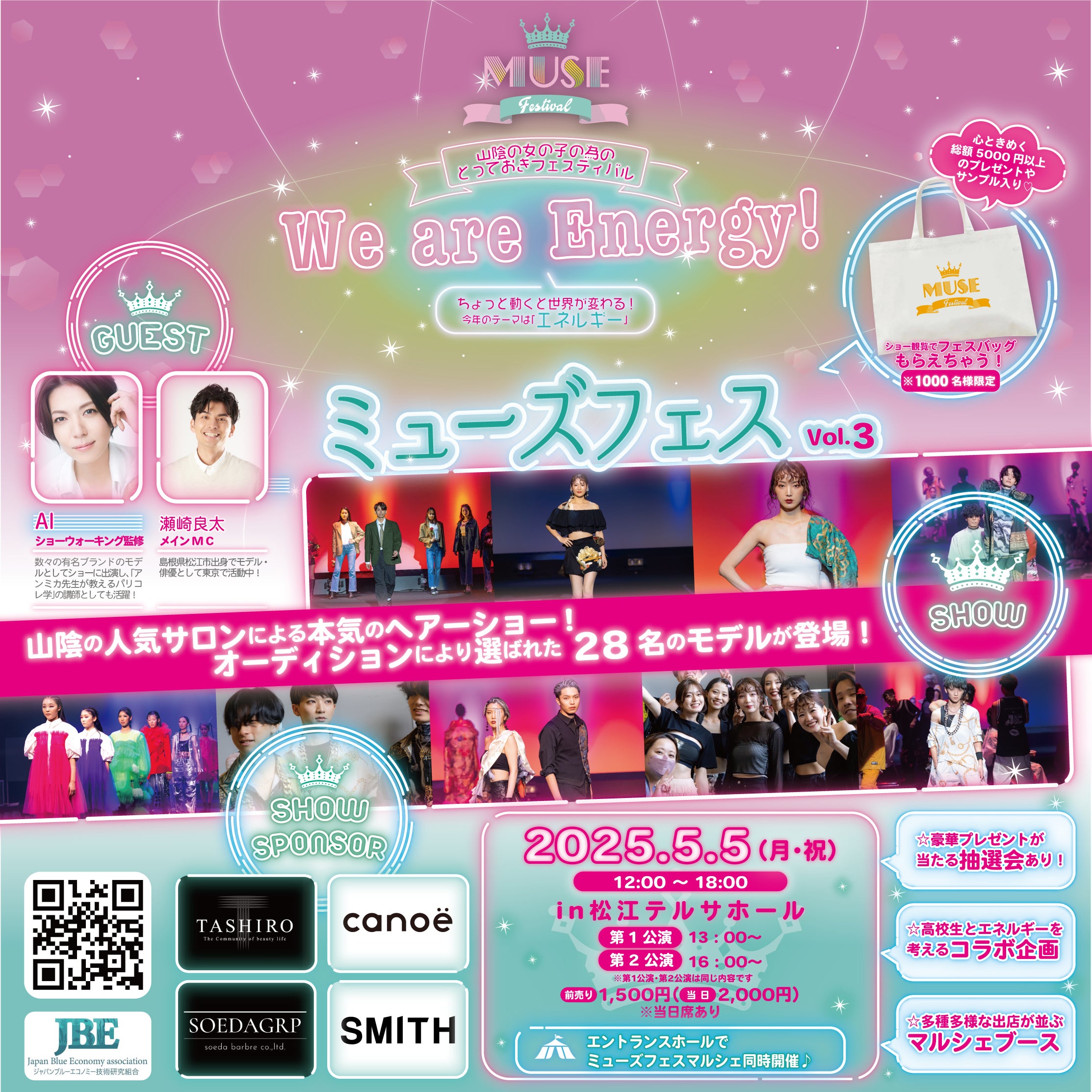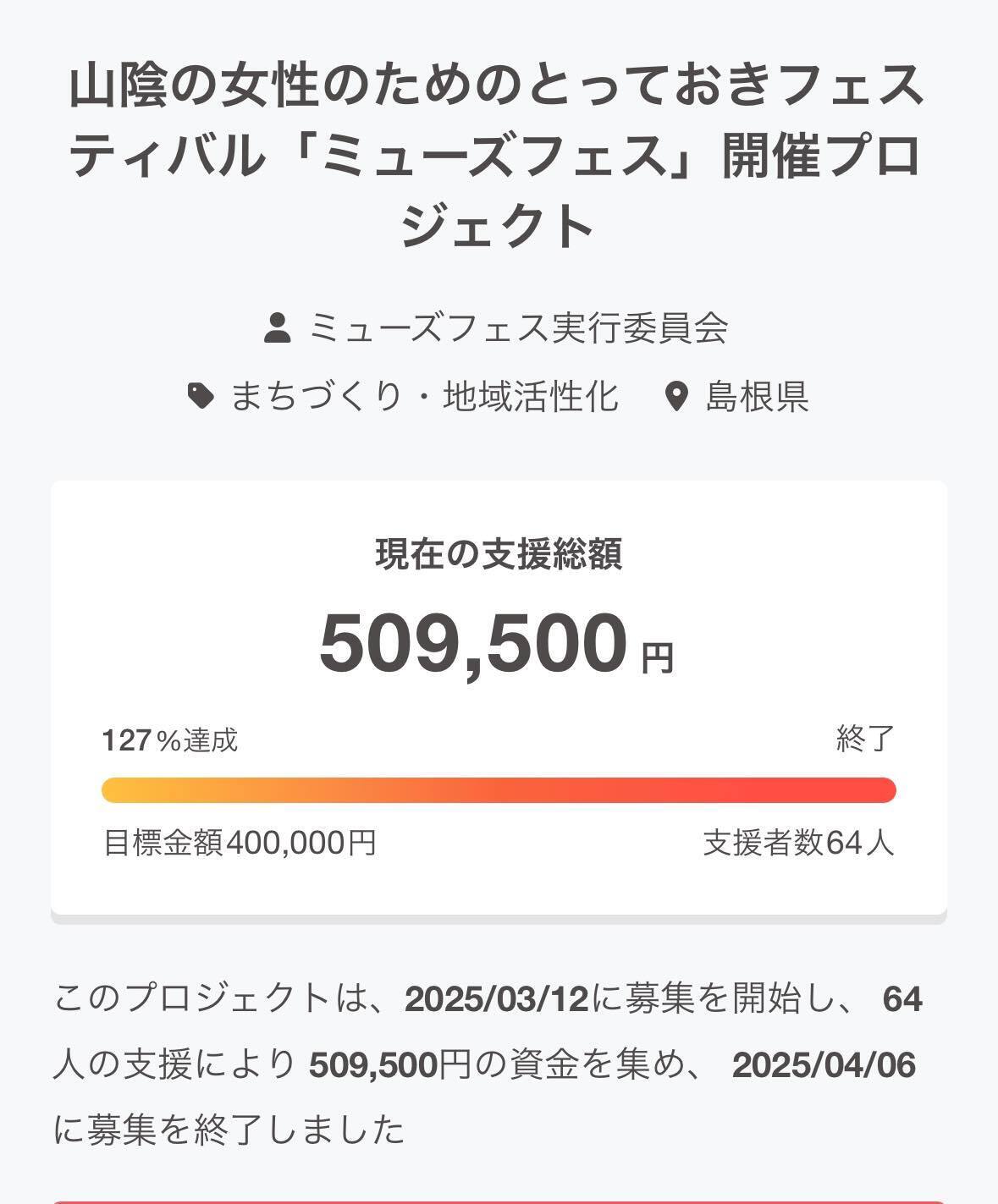2025/04/06 10:38皆さま、おはようございます!ミューズフェス・プロデューサーの田村くみです。日々ミューズフェスのプロジェクトに温かいご支援と愛あるメッセージ、本当にありがとうございます!クラウドファンディング現在116%超…今回応援してくださった全ての皆さまに心から感謝をお伝えします。 女性を元気にキラキラ輝かせたい!街を元気にしたい!山陰の魅力を世界に知って欲しい!その為に最高のステージを作り上げたい!そんな我々の想いにたくさんの方々が共鳴くださり今回も目標達成できました。第二回ミューズフェスで上定松江市長と共にサプライズゲスト登場してくれたギターウルフ・セイジさんはニュージーランド&オーストラリアツアー真っ最中ですがツアー先のオーストラリアからご支援くれました♡ミューズフェスのランウェイに立ってからギターウルフ・セイジさんはいつもミューズフェスを「山陰の光だ!素晴らしいフェスだ!」と国内外のたくさんの人に伝えてくれています。世界を股にかけるアーティストからのエール、地球の反対側から応援本当にありがとうございました。ミューズフェスが繋ぐエネルギッシュでパワフルなご縁で、今回も過去最高を更新するステージをどうぞ一緒に作ってください!クラウドファンディングも本日最終日になります。残り13時間のプロジェクト!よりたくさんの皆さまに最高の1日を過ごしていただくため、最後の最後までご支援よろしくお願いします。それでは、5月5日(月・祝・こどもの日)松江テルサにてたくさんの煌めく笑顔、お待ちしています。「We are Energy!(私たちはエネルギー!)」 もっと見る
