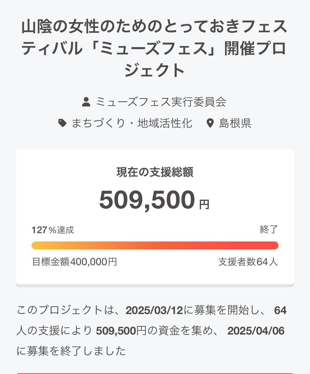 2025/04/07 09:24皆様!おはようございます!昨夜で、クラファンが終了しました!なんと目標の40万円を超えて、509,500円という結果に!!本当にありがとうございました。今回は、期間も短くなかなか難しいのではないか・・・と思っていましたが、本当に感謝感謝です。密かな目標として60人以上の方にご支援をいただくという目標も達成できました。フェスを作り上げる事もですが、クラウドファンディングをするのも結構精神削られます…。応援してもらえなかったらどうしよう…お金くださいとか言いにくいし…迷惑がられたら嫌だな…など、ネガティブな気持ちも沸いて怖くなることも正直あります。でも、ミューズフェスを通じて、出会う前向きでキラキラしたヘアサロンの皆さんやモデル達を見ていると、『絶対に成功させなくては!』と強く思え、みんなの為だと頑張れてしまうのです!!そんなドキドキを抱えながらスタートしたクラファンも無事に終了し、たくさんの皆様の愛に感動と感謝が溢れています。本当にありがとうございました。フェス本番まで一か月を切り、猛ダッシュで準備をしていく期間となりました!ぜひ、クラファン応援してくださった皆様!ミューズフェスの事、宣伝お願いいたします!集客頑張ります!!!!引き続きどうぞよろしくお願いいたします!! もっと見る