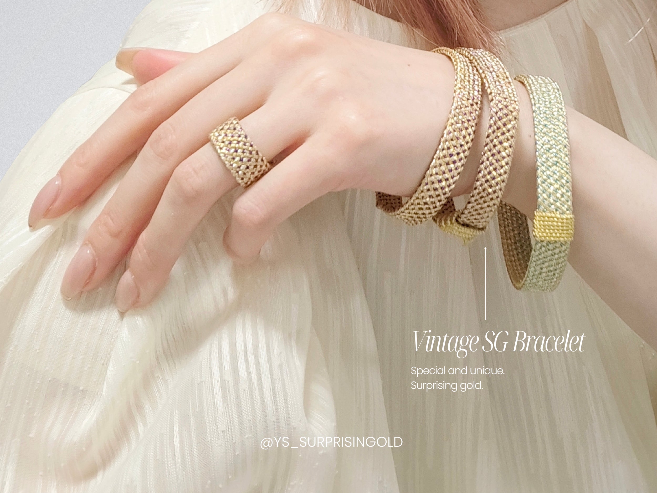 そんな組紐で編み込まれた、繊細で上品かつ美しいゴールドカラーが、まるでヴィンテージジュエリーのように輝きます。