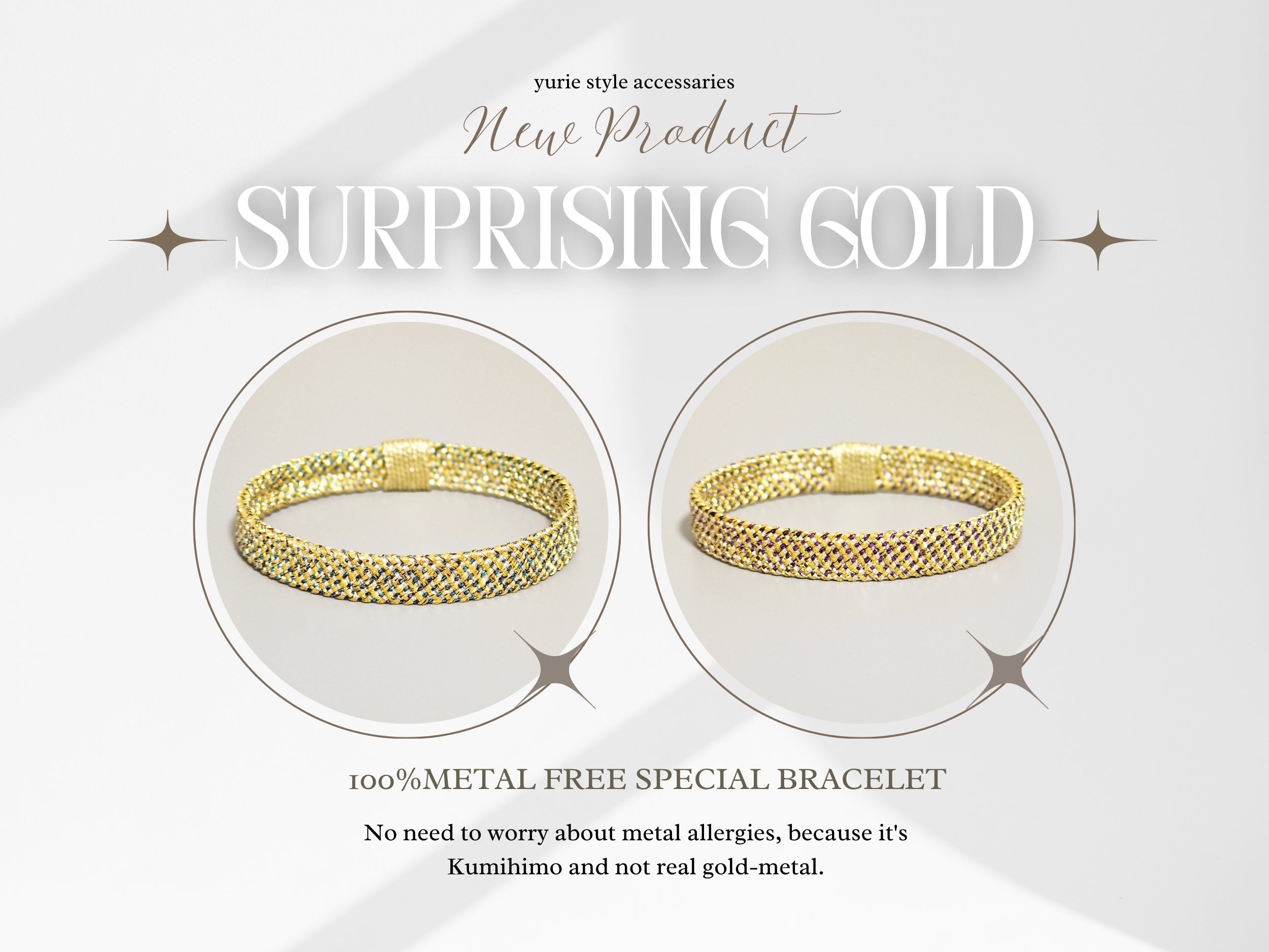 Surprising Gold〈サプライジングゴールド〉は、京都の伝統工芸「組紐」技術を活かして作られた職人手作りの、金属アレルギーの方にも優しい設計のブレスレットです。