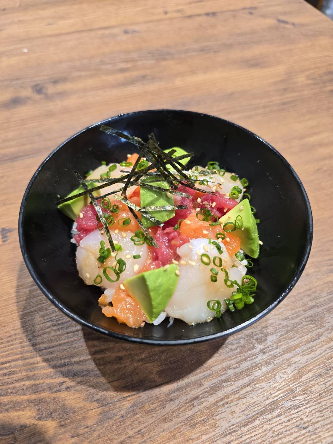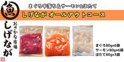 まぐろの中落ち、サーモン、ホタテの3種類の魚貝を組み合わせました。