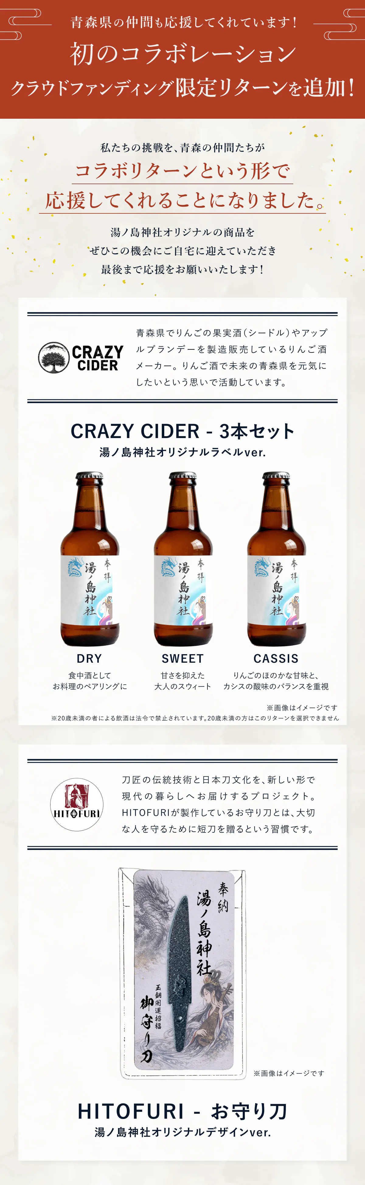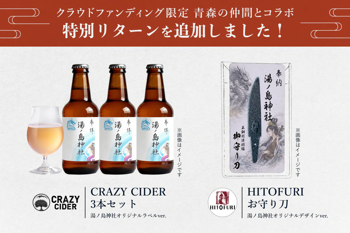 2026/03/13 19:49こんにちは。浅虫湯ノ島弁財天のプロジェクトを応援してくださりありがとうございます。 大鳥居の再建のためのこの挑戦も残すところ20日を切りました。 そこでプロジェクトのラストスパートのために、同じ青森県で以前クラウドファンディングに挑戦されていた青森県のシードル・アップルブランデーメーカーであるCRAZY CIDERさん (https://crazy-cider.co.jp/)に協力を依頼し、湯ノ島神社オリジナルラベルのCRAZY CIDER3本 セットを追加リターンとしてご用意しました! 【CRAZY CIDER 湯ノ島神社オリジナルラベルver.】20,000円御朱印デザインのオリジナルラベルバージョンは、今回のクラウドファンディングでしか手に入ら ないものですので、ぜひこの機会に青森りんごの魅力をお楽しみください! 【青森県平川市りんご酒醸造所 CRAZY CIDERとは】 ーーーーーーーーーーーーーーーーーーーーーーーーーーー 地域の課題解決を果たし、世界に誇る「りんご酒メーカー」を目指すりんご酒醸造所です。 りんご王国・青森は日本一のりんご生産地と言われていますが、高齢化による農家の担い手の 減少、耕作放棄園の増加、日本国内の生食用りんごの消費数の激減など危機的な状況。一方 で、ヨーロッパのりんご産業のほとんどはシードルやアップルブランデー用の加工用りんごの栽培が多く、少人力で生産効率を高めることにより農家の所得も安定しています。 そこでCRAZY CIDERは、これらの課題を解決し、青森県のりんご産業をもっと豊かで未来のある産業に発展させるために、世界に認められる「りんご酒メーカー」を目指し、青森りんごを使用し たシードルを世界に発信しています。 【CRAZY CIDER シードルのご紹介】 ーーーーーーーーーーーーーーーーーーーーーーーーーーー キレがあるのに、フルーティー。ドライだからこそ感じるシャープな喉越し。それは非加熱処理のドラフトハードサイダーならではの新しい心地よさ。ほんのりとした甘みと酸味の絶妙なバランス は、飲むシーンを選びません。 乾杯酒や食中酒にもぴったり。肉料理や煮込み料理はもちろんのこと、地元の食材と合わせるのもおすすめです。例えば青森ならシャモロック(地鶏)焼きや、津軽愛情豚のポークソテーなどとの相性は抜群。また地元で採れる根まがりたけやプチトマトを使ったピクルスに合わせても、新 鮮なマリアージュが生まれます。暑い日にはゴクゴクと飲み干すのも気分爽快。この1杯からクリエイティブなアイデアが生まれるかも! スウィートタイプは青森県産の高品質なりんごの果実感と、ほんのりとした甘みを活かしたハー ドサイダー。スウィートなだけでなく、複雑なフレーバーが特徴です。甘さの中に南国のフルーツやキャラメルなどの風味を感じられます。食前酒、食後酒の一杯としてはもちろん、肉料理のほか幅広い料理とのペアリングをお楽しみください。 さあ、素敵な時間へようこそ。 カシスフレーバーはCRAZY CIDER SWEETをベースに、青森県 産のカシスをブレンド。全く新しいハードサイダーが誕生しました。シャープな喉越しの中に感じる、さわやかなカシス感。香りは複雑なアロマを発するものの、飲み口は爽やかで後抜けのよい セッティングです。 食前酒、食後酒の一杯としてはもちろん、クリーム系・チーズ系の料理との相性は抜群です。例えばサーモンのタルタルやカルパッチョと一緒にお楽しみください。 もっと見る湯ノ島カタクリ祭のお知らせ