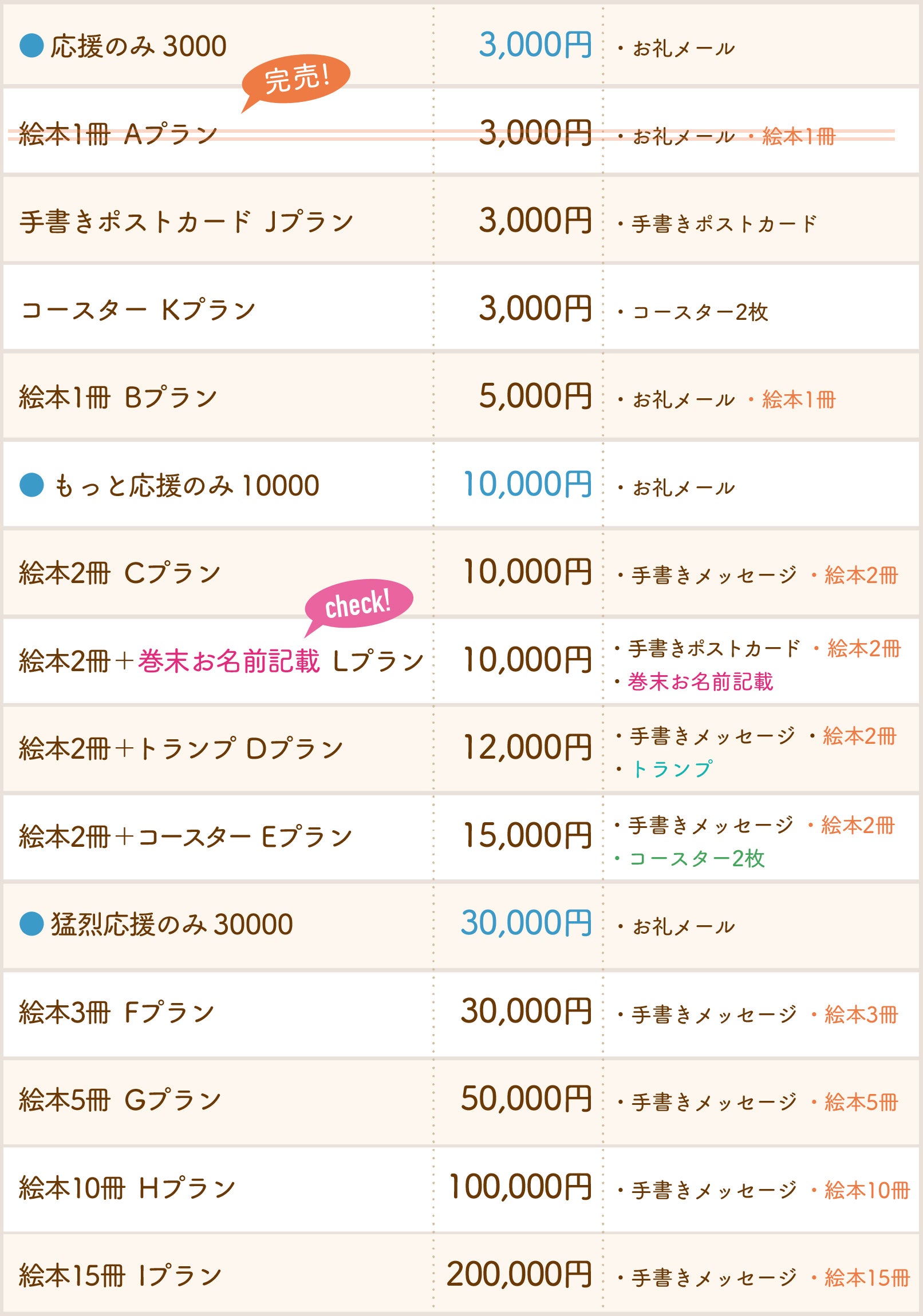 絵本の最後のページに支援者さまの名前を記載する「巻末お名前記載」のリターンと、支援金3000円の「手書きポストカード」または「コースター2枚」のリターンも追加しました。(2025年2月26日)