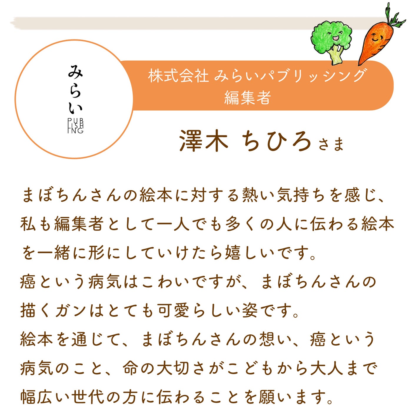 「二人に一人が癌になる時代」と言われてる中、癌の授業をする学校も増えてきているそうですが、この病気の事をよく知らない子供達やその親達が、癌の事を知る最初のきっかけになる事を願って、これからも様々な絵本を制作していきたいと考えています。