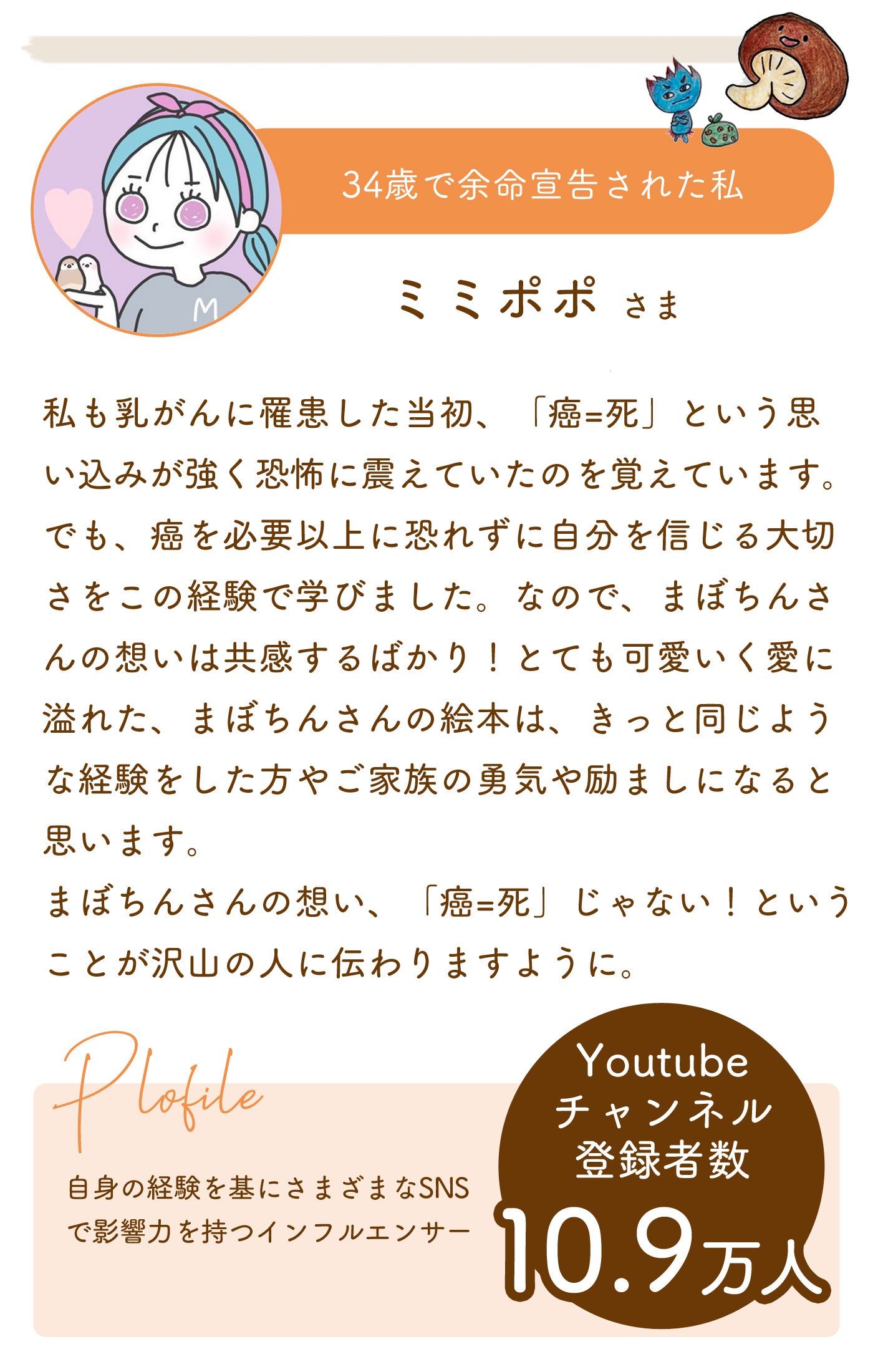 この絵本は、私と同じように闘病している方や、その側で支えてくれている方達など、一人でも多くの方に届いてほしいと願っています。