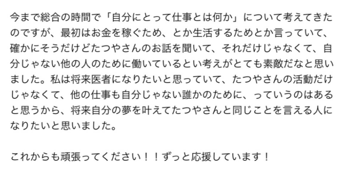これまで、全国の小学校・中学校・高校・大学で講演を行い、多くの子どもたちと出会ってきました。彼らからはこんな感想が寄せられています