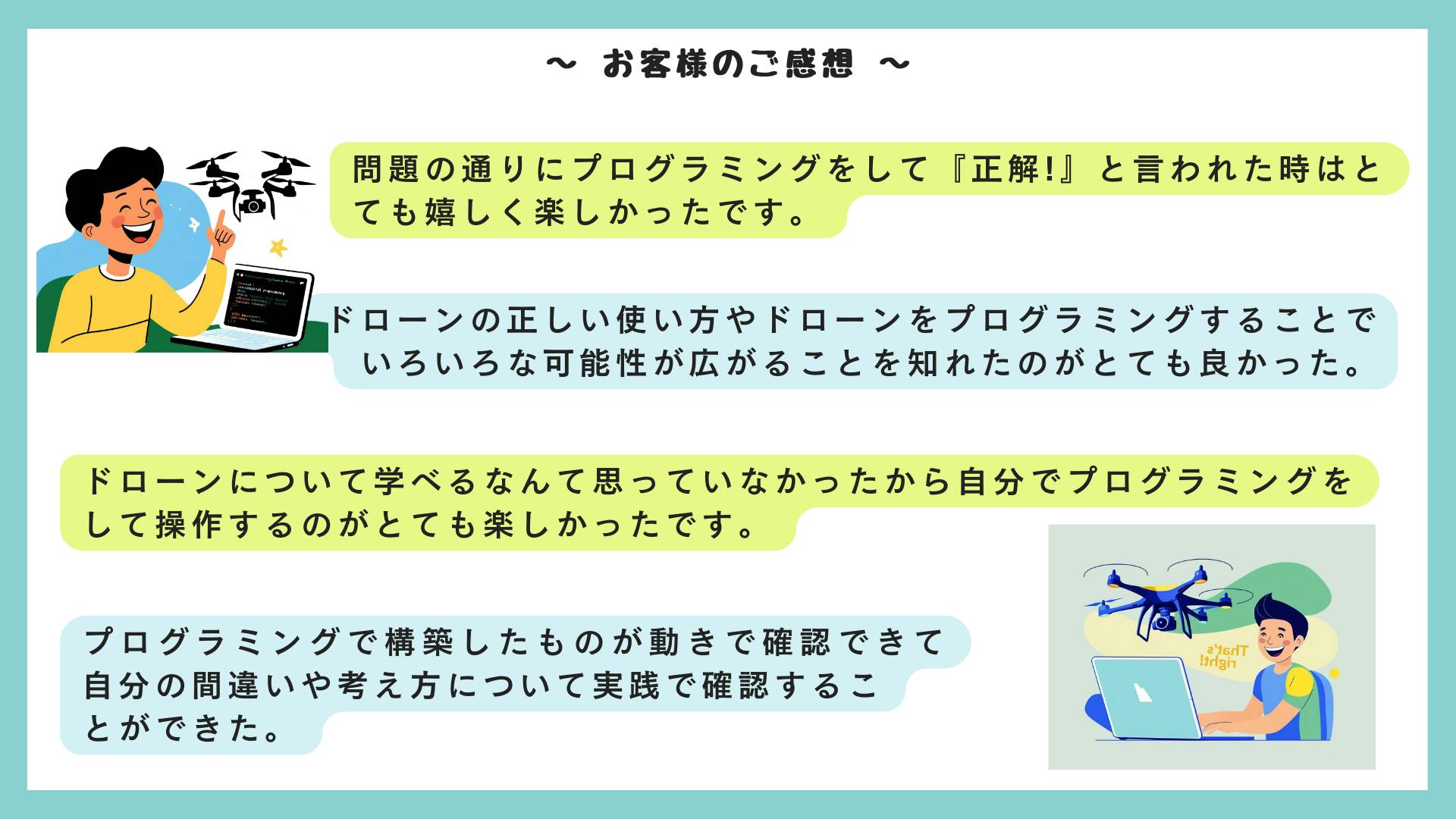 「プログラミングは難しい」「子どもに教えるのは無理」「自分にはできない」――そんな常識を私たちは覆したいのです。プログラミングは本来、楽しみながら自然と身につくもの。その可能性をもっと多くの子どもたちに届けたいと考えています。