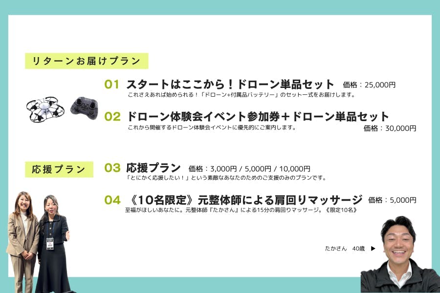 ドローン本体や体験イベントに必要な道具など、皆さまへのリターン品の準備に使用させていただきます。