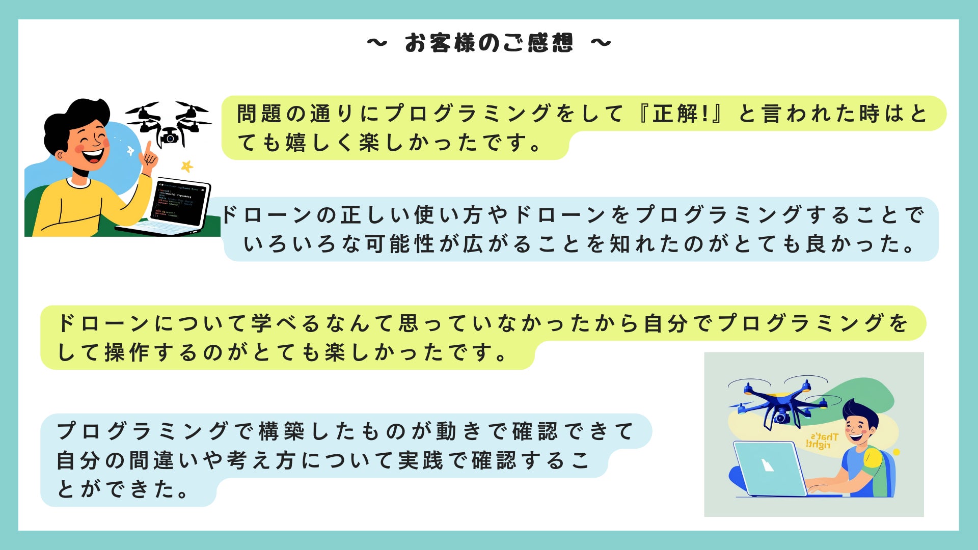 こんにちは!私たちは、未来の教育を形にするエドテック企業として、次世代を担う子どもたちに楽しく学べるSTEAM教育を提供しています。ドローンプログラミングをはじめとする実践的な学びを通じて、創造力や論理的思考力、試行錯誤する楽しさを育むことを目指しています。