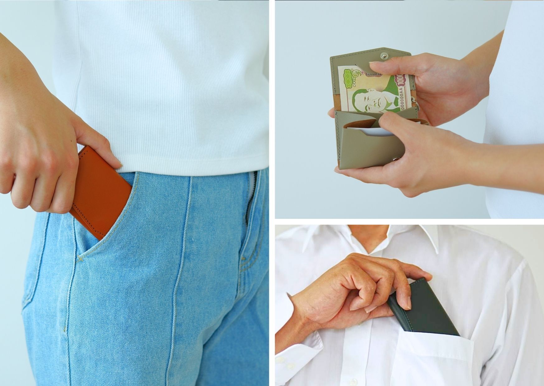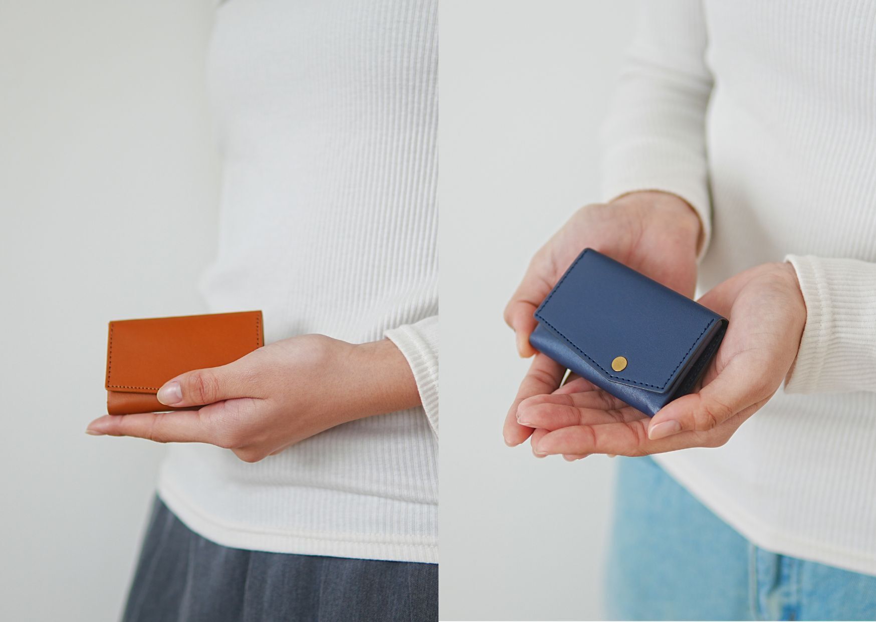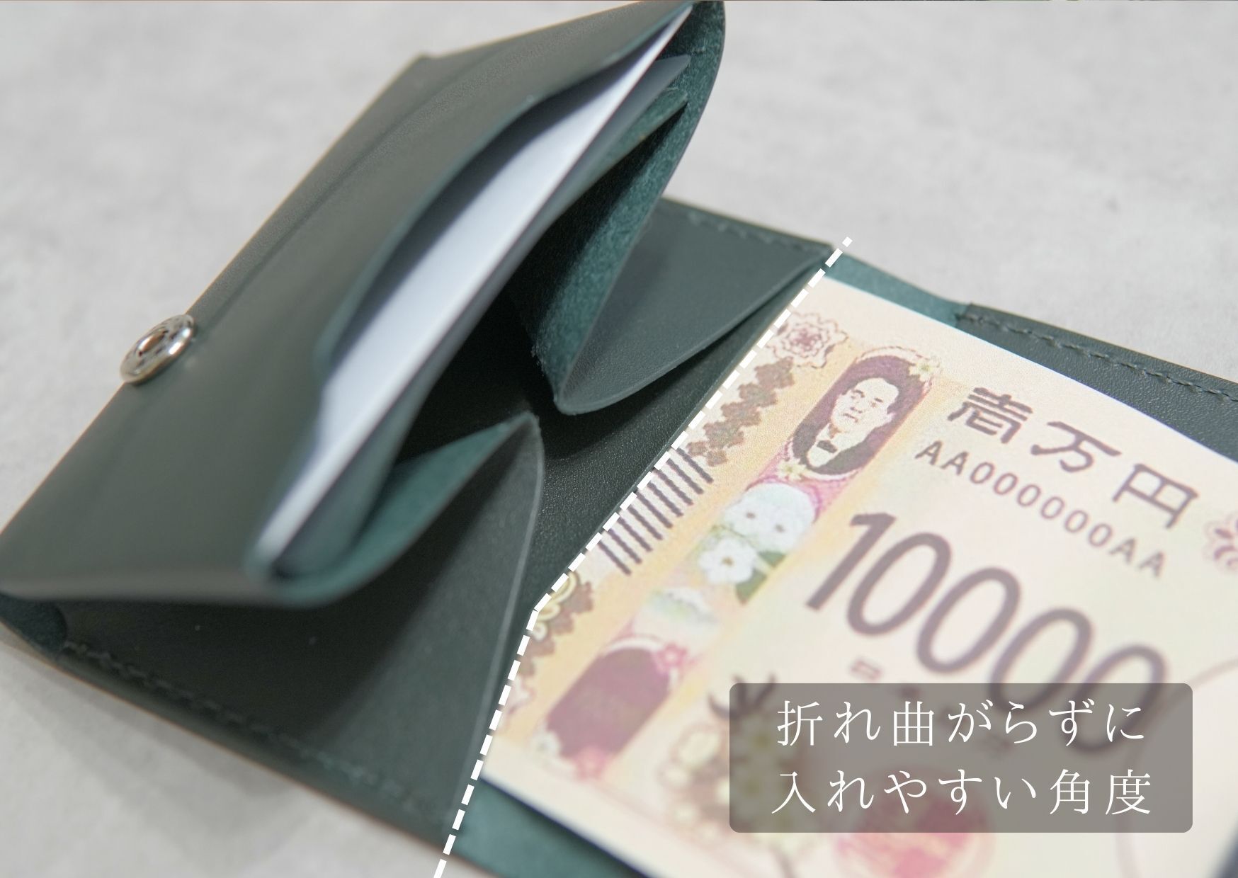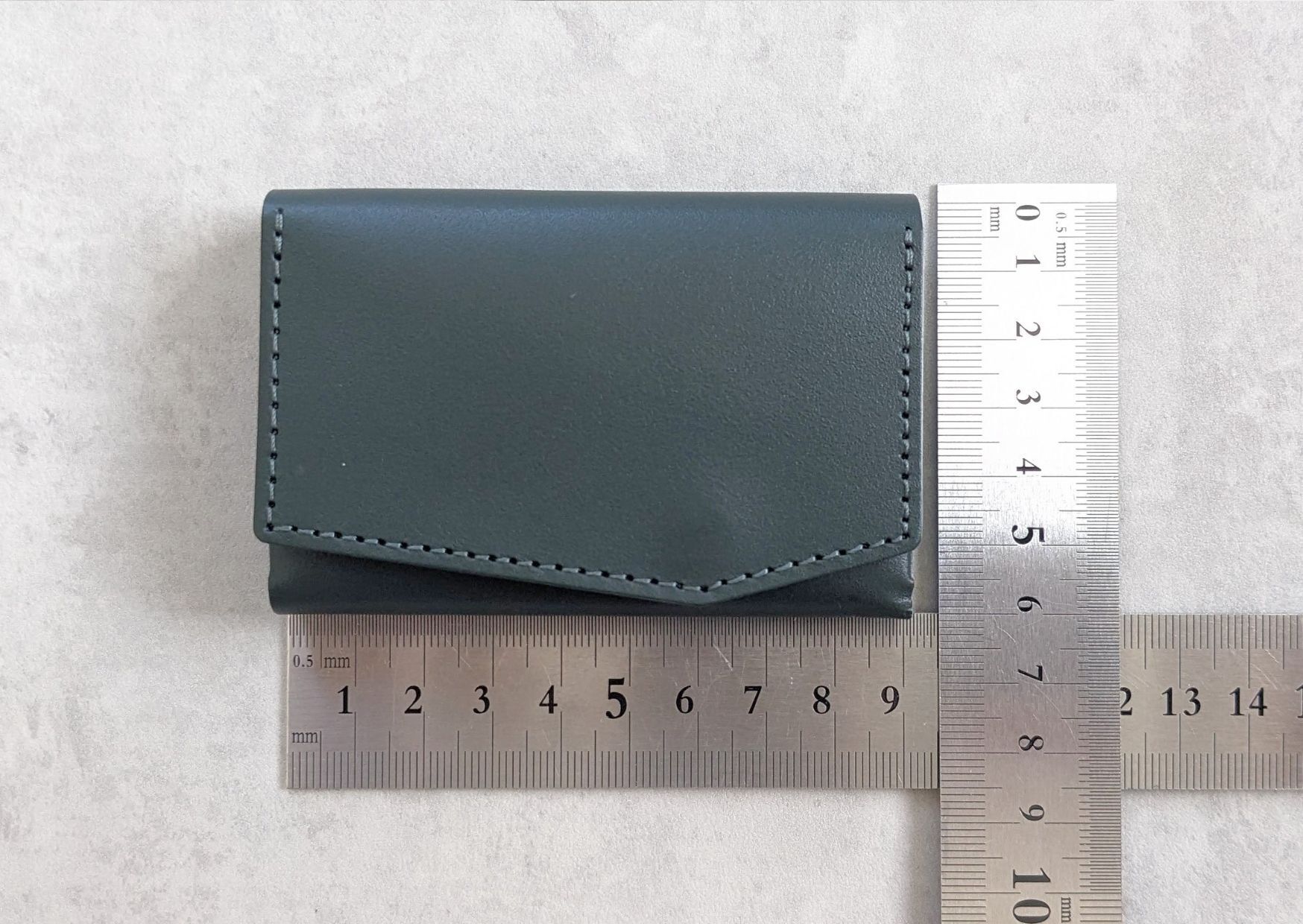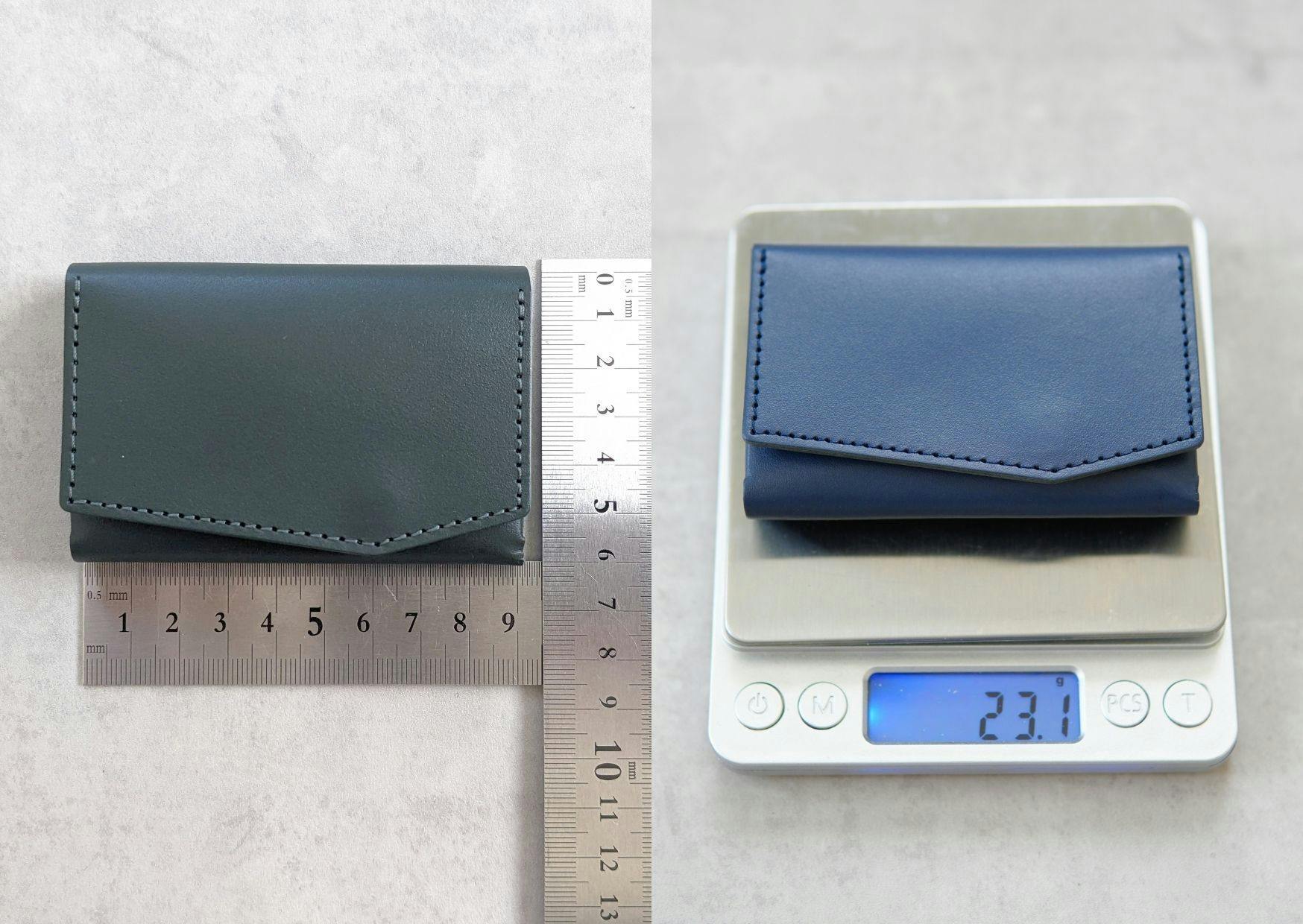 カード収納部のマチを縫わずに折り曲げ構造にすることで実現した、横幅がほぼカードサイズ(カード幅8.5cm、財布幅9cm)の極小財布。