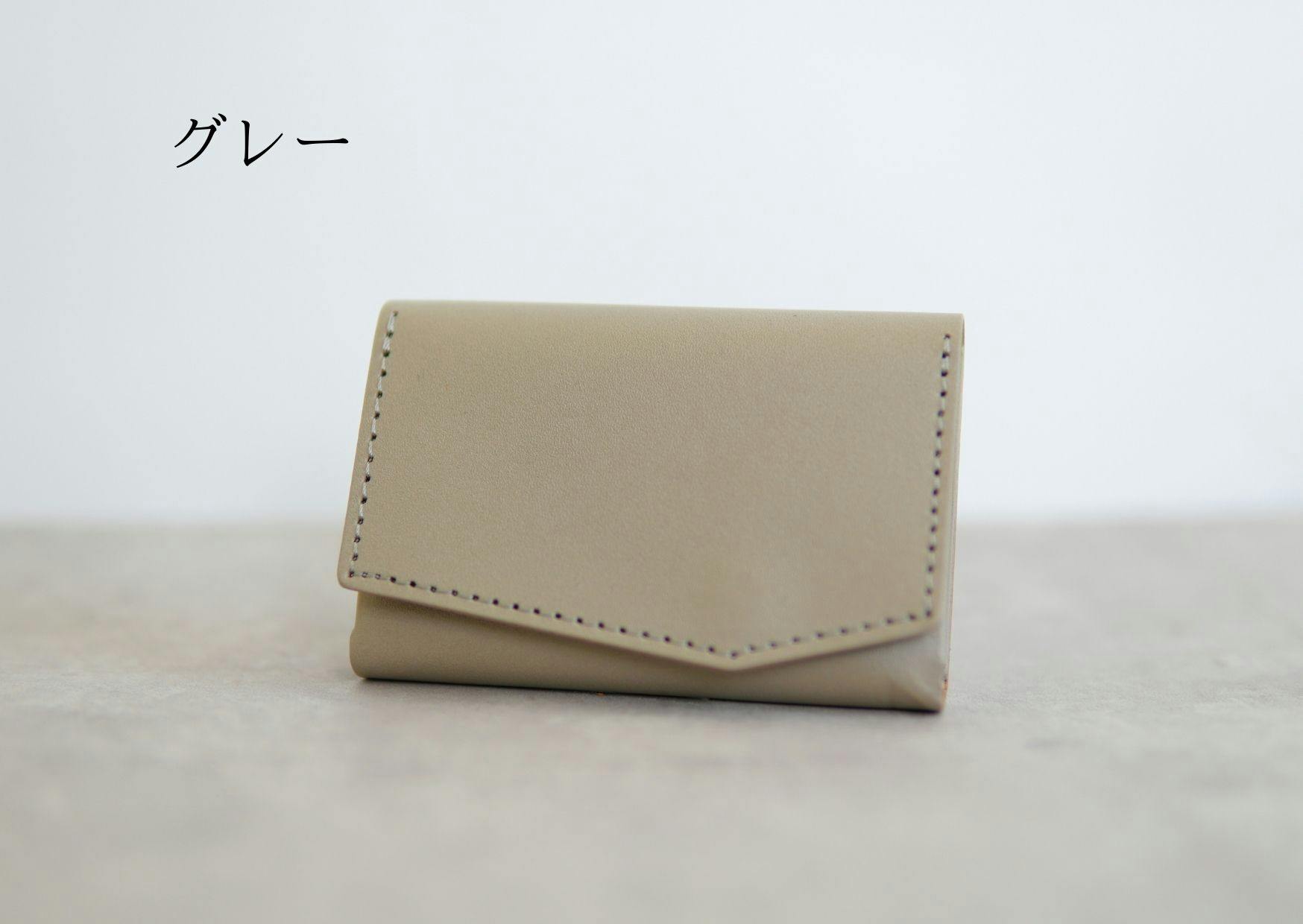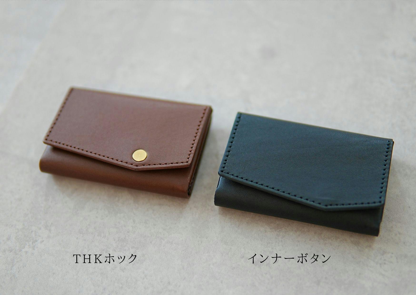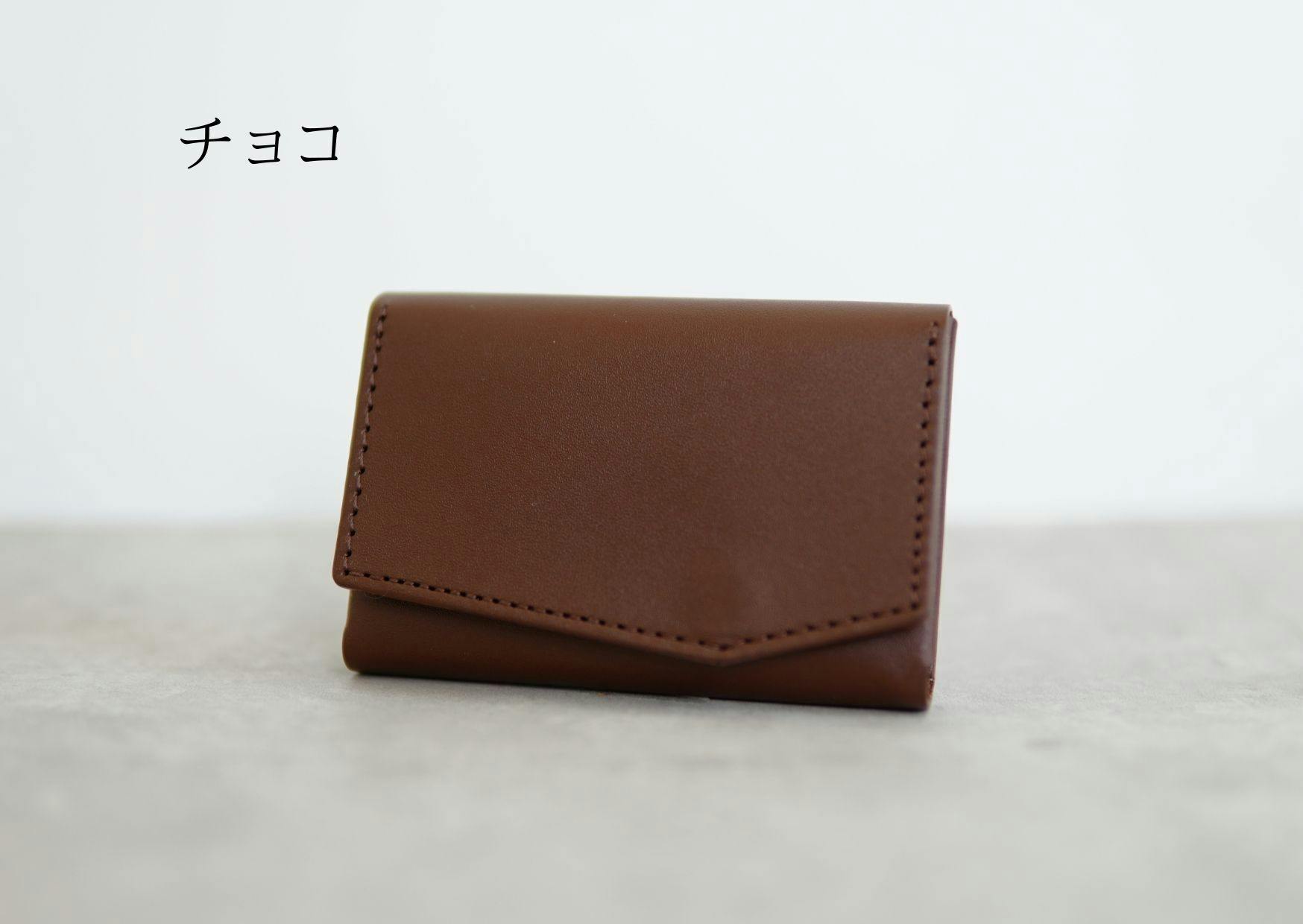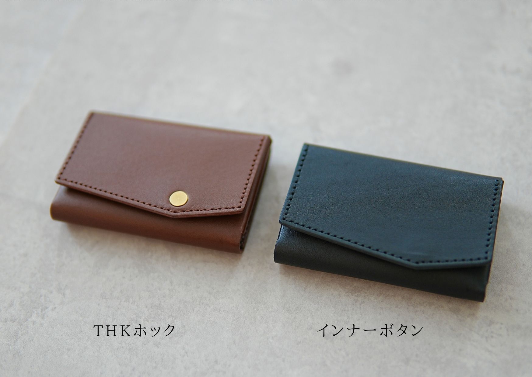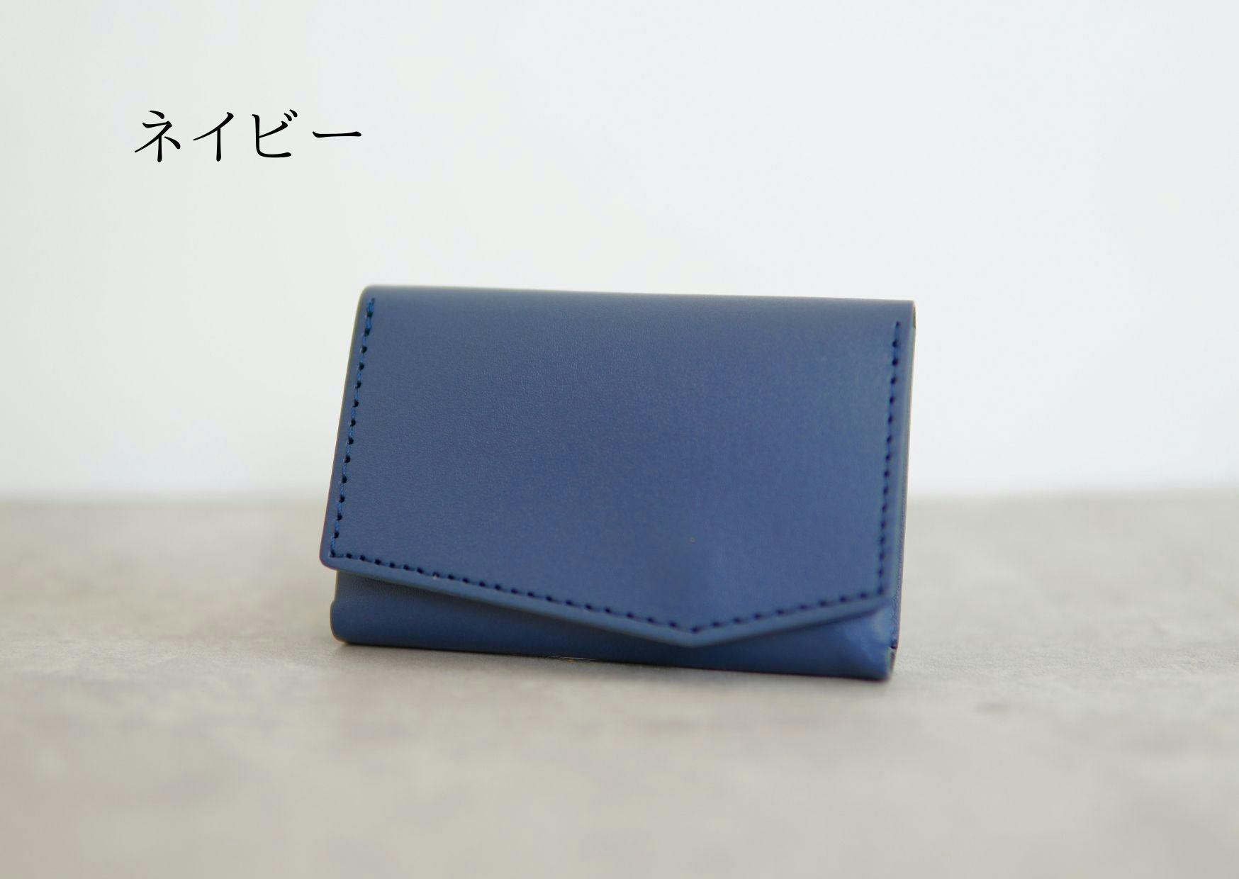 カード収納部のマチを縫わずに折り曲げ構造にすることで実現した、横幅がほぼカードサイズ(カード幅8.5cm、財布幅9cm)の極小財布。