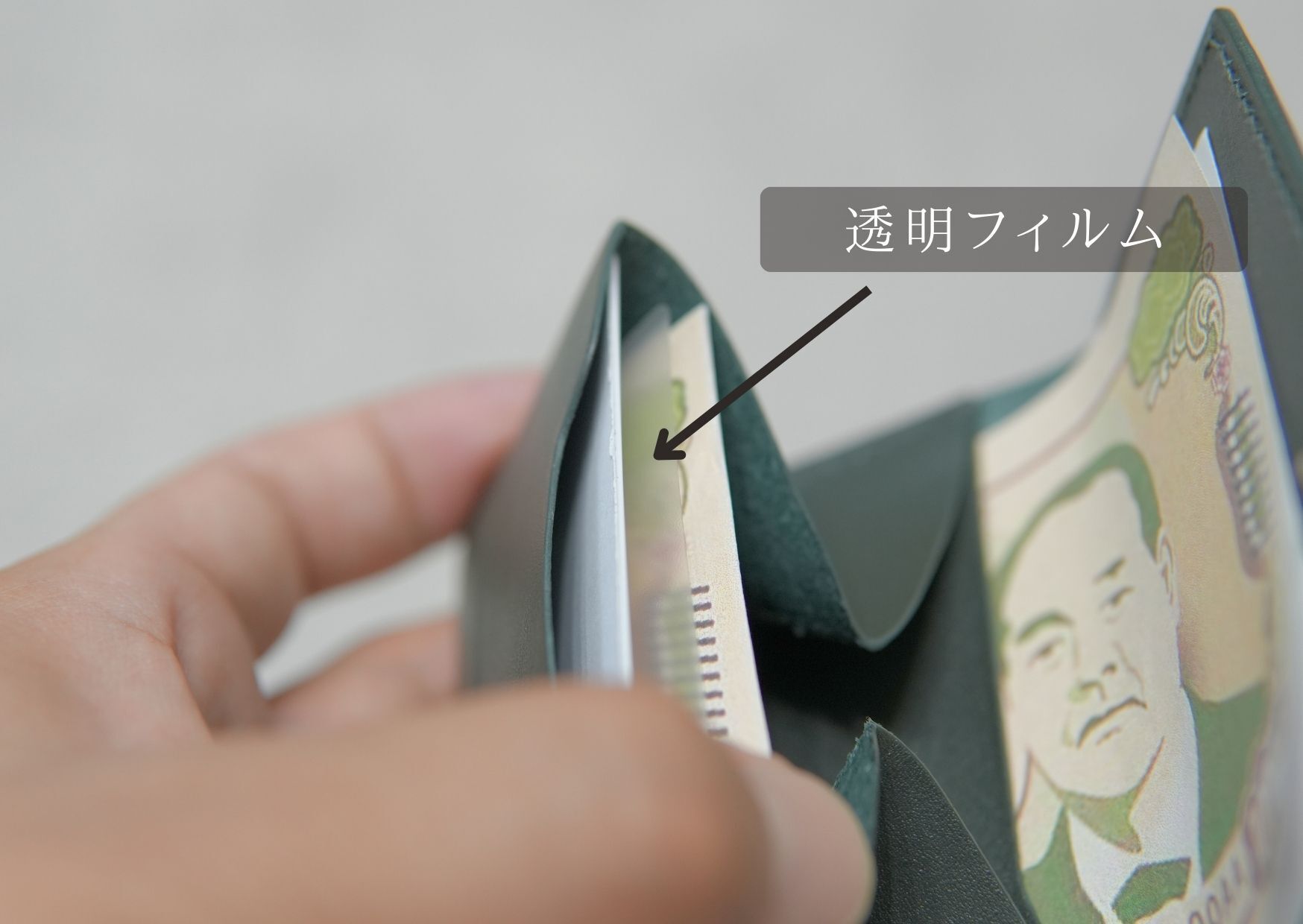お札が滑らかに動けるように透明のフィルムを革の間に縫い付けてあります。このフィルムの上をお札が滑り、またカードのスペースとの仕切りにもなっていること、財布の開く角度を徹底的に見直したことでスムーズに出し入れすることが可能となりました。