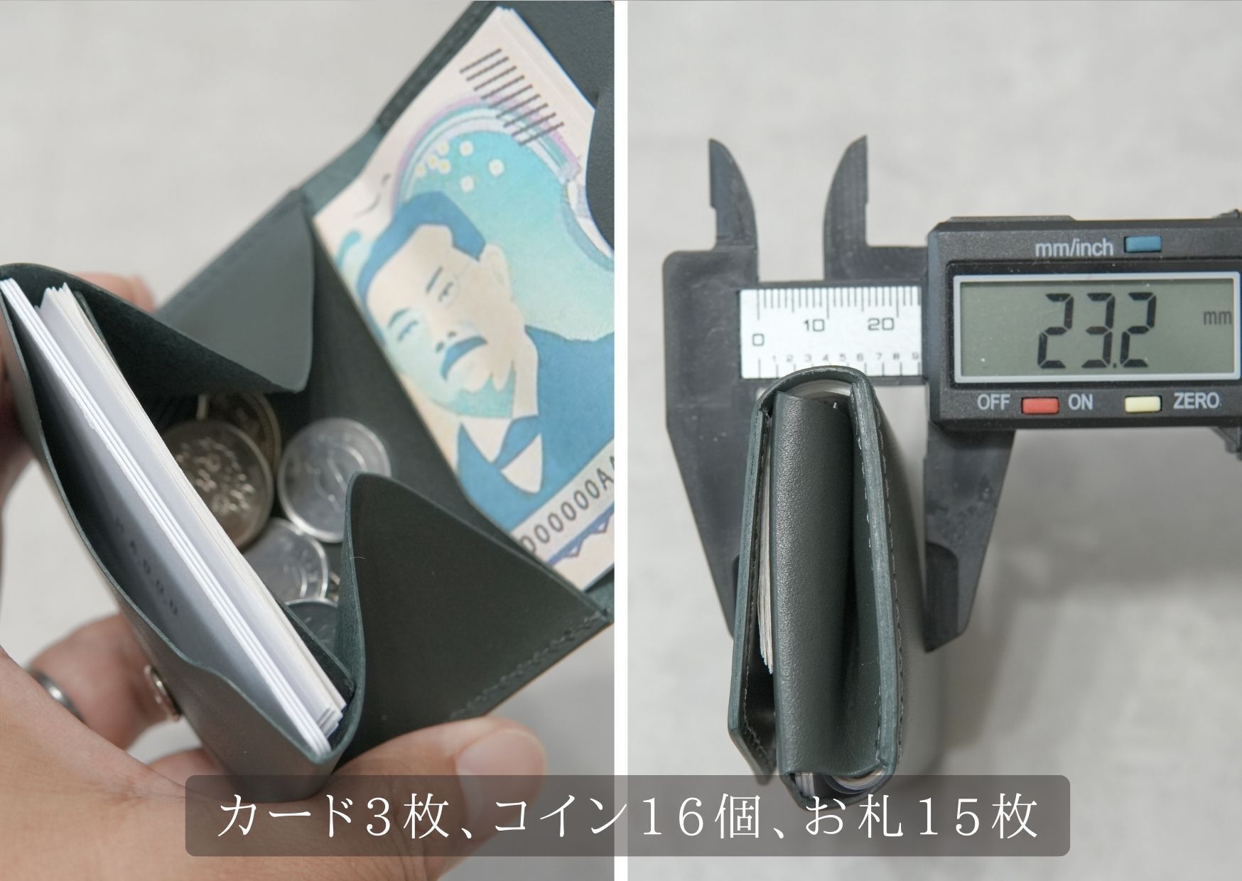 推奨容量のカード5枚、コイン12枚、お札10枚を入れて厚みは23mmほどです。こんなに小さいのに十分な容量を確保しました。