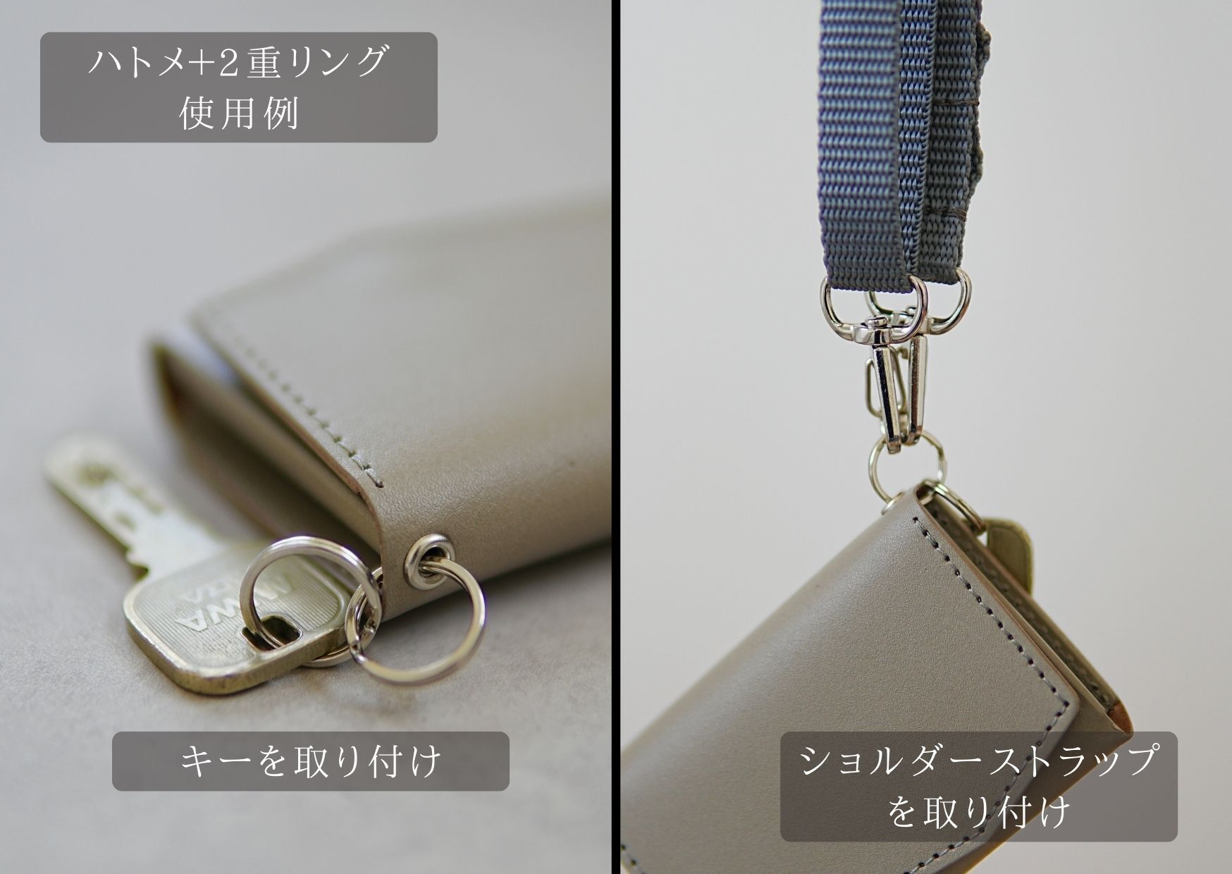 キーを取り付けたり、ショルダーストラップに取り付けたりアレンジしてお使いいただけます。machi-yaでは、取り付けサービスとさせていただきます。購入ページで「ハトメ+2重リング・有り」をお選び下さい。