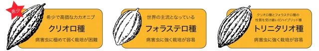 わたしたちが取り扱うカカオニブは、カカオ豆の中でも希少品種といわれる【クリオロ種】のみです(上の図 / 左)。クリオロ種のカカオは海外では「ファインカカオ」「フレーバーカカオ」とも呼ばれ、その香りはフルーティーでナッツのような食感が特徴です。豆の味と香りが上質であるとされており、カカオ市場では【高級カカオ】として珍重されています。
