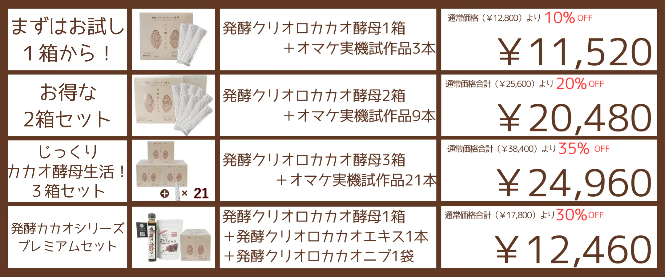 セット内容:発酵クリオロカカオ酵母×1箱、発酵クリオロカカオエキス1本、発酵クリオロカカオニブ