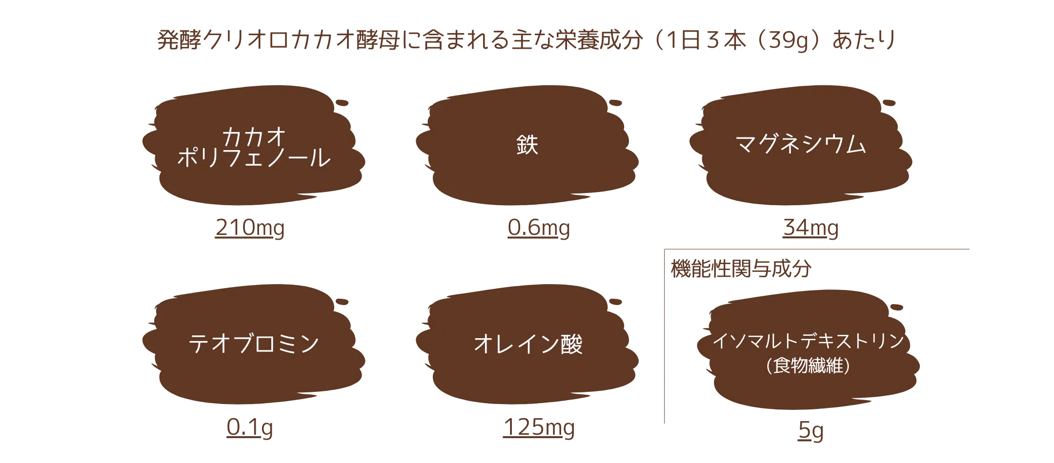 発酵クリオロカカオエキスは濃厚なフルーティーな香りとスッキリとした風味をお楽しみ頂けるとともに、発酵のチカラ(酵母菌)で健やかな暮らしをサポートします。