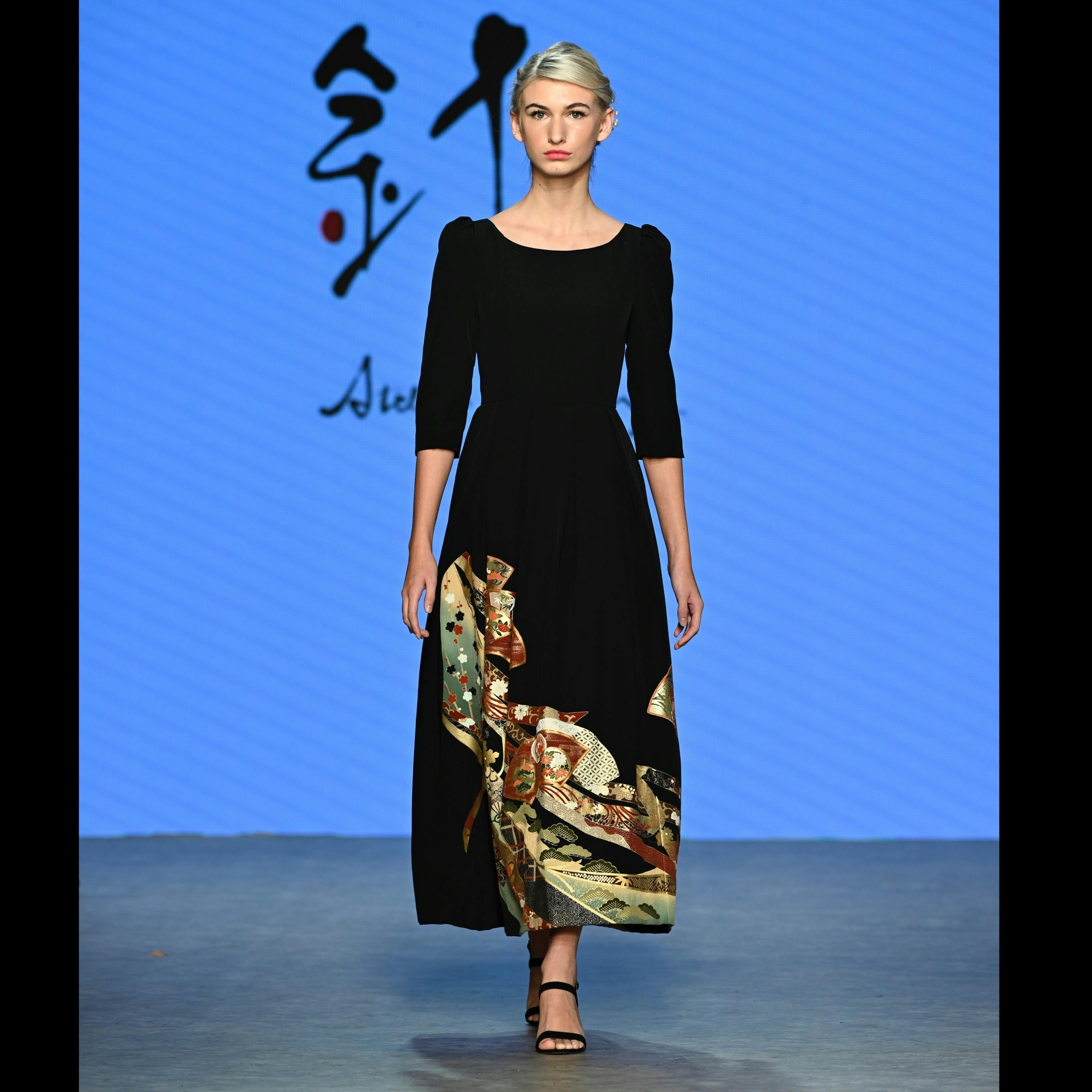 令和の今、春菜さんがパリへとひっさげて行くキモノ・ドレスは、まさにその時の大波に匹敵するかもしれない。なぜなら彼女が作るドレスの素材はすべてホンモノの着物。日本人の最高礼装でありながら、フォーマルな機会がないばかりにクロゼットで眠らざるを得なかった着物たちを、ふたたびドレスとして蘇らせ、日常の場に連れ出すのだから。