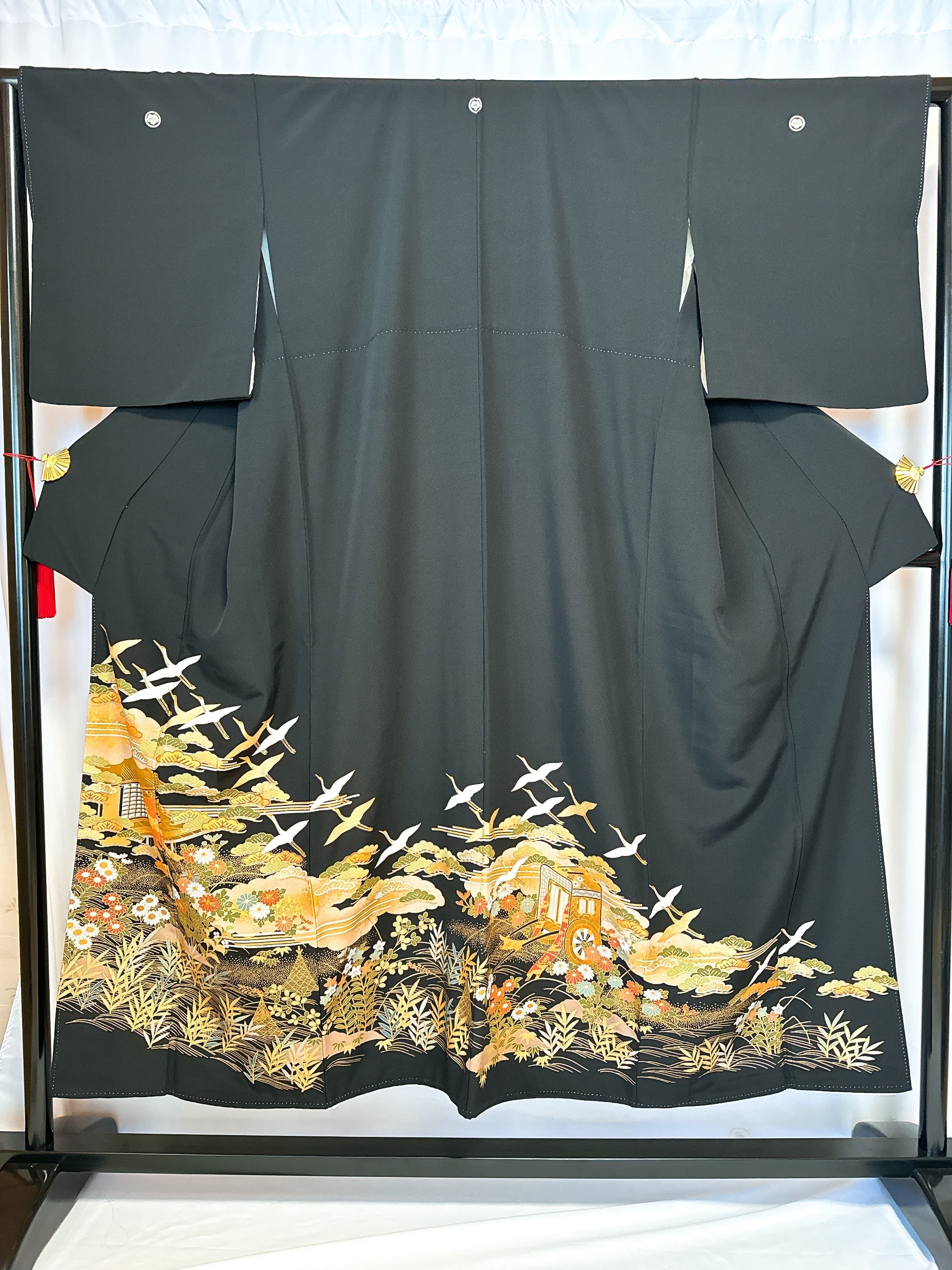 特に私が好きなのは女性の最高礼装「留袖」。黒がベースで、胸元と背中、袖に入った家紋が5つ、膝下足回りに豪華な続き柄が1周施されている。この留袖は、主に結婚式で新郎新婦のお母様など、親族の既婚女性しか着られないものです。