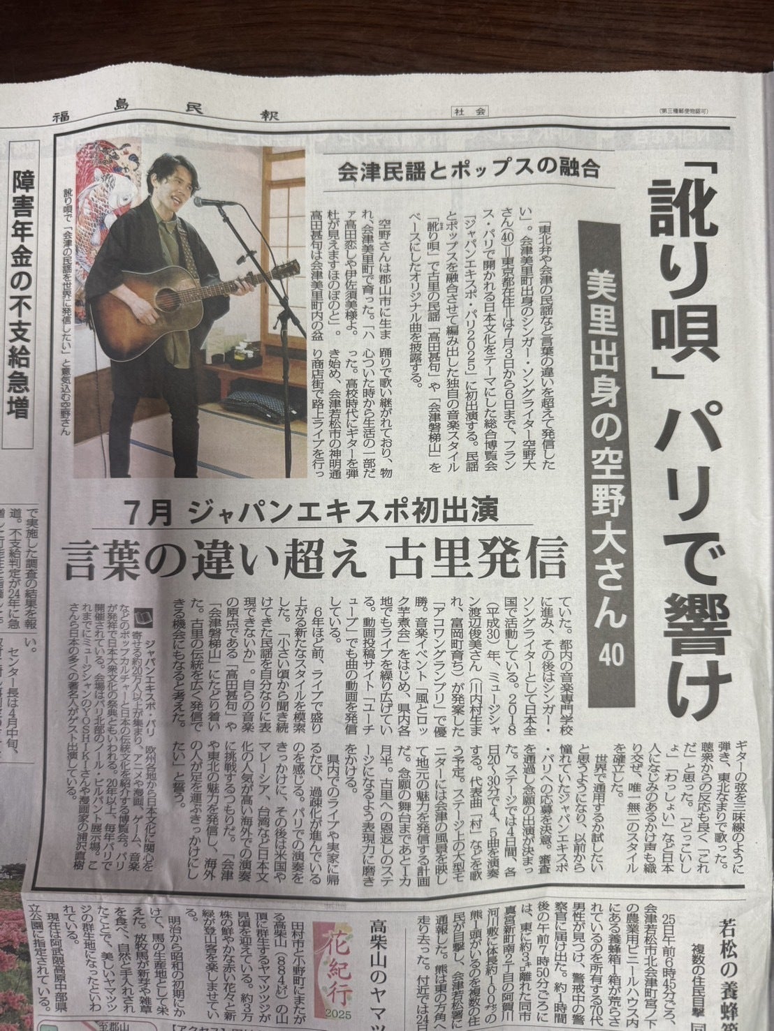 2025年5月26日の福島民報様の朝刊にて、今回のフランスで行われるJapan Expo Paris 2025の出演を取り上げてくださいました! 風とロック、アコワングランプリからお世話になっています!本当にありがとうございます! 風とロックCARAVAN福島で、生放送で触れてくれた箭内さんにも感謝を。